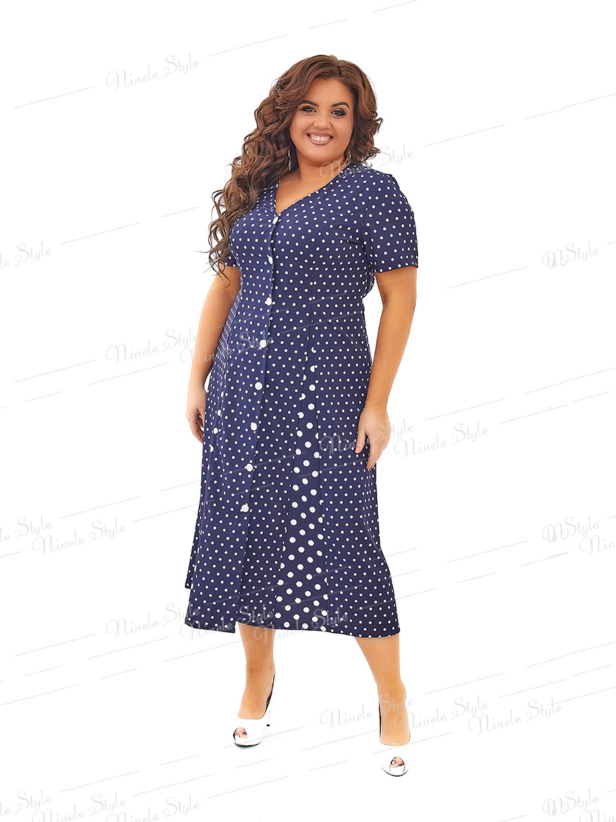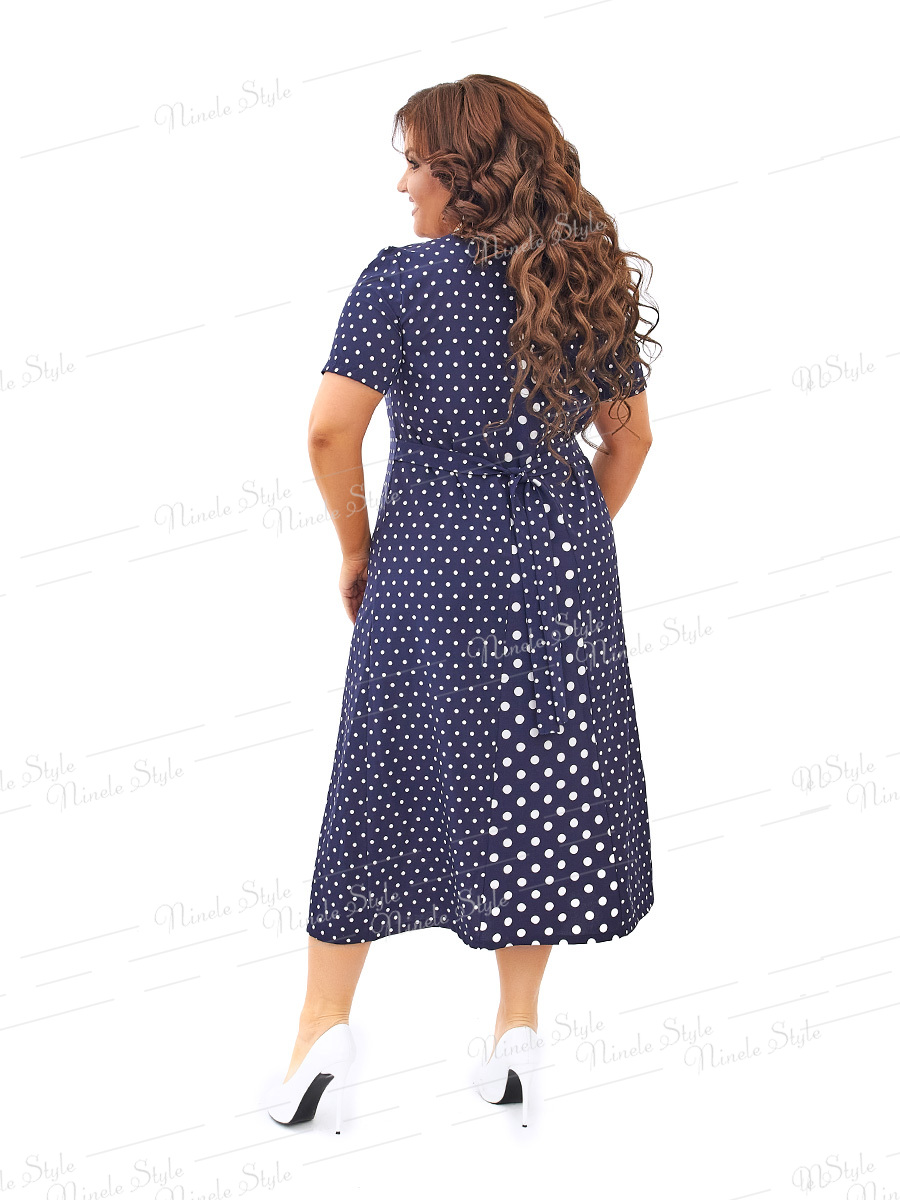 Платье женское выполненное из двух видов ткани. в горошек (крупный и мелкий) с V образной горловиной. Втачным коротким рукавом и втачным поясом в боковых швах. Перед платья с рельефами. От талии в рельефы вставлены клинья в крупный горох. Спинка из двух частей. По центру вставлен клин  в крупный горох. Платье будет актуально на каждый день