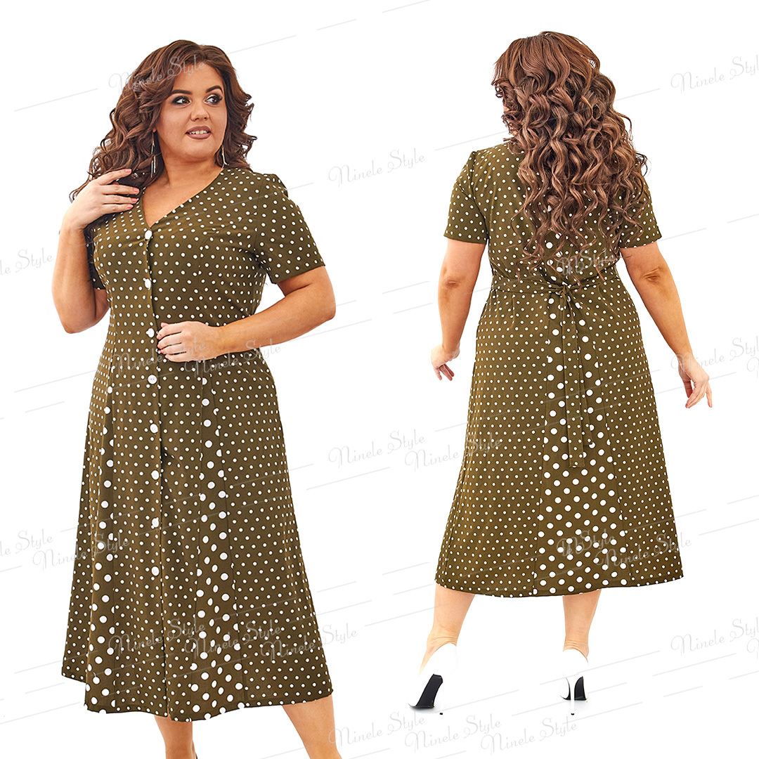 Платье женское выполненное из двух видов ткани. в горошек (крупный и мелкий) с V образной горловиной. Втачным коротким рукавом и втачным поясом в боковых швах. Перед платья с рельефами. От талии в рельефы вставлены клинья в крупный горох. Спинка из двух частей. По центру вставлен клин  в крупный горох. Платье будет актуально на каждый день