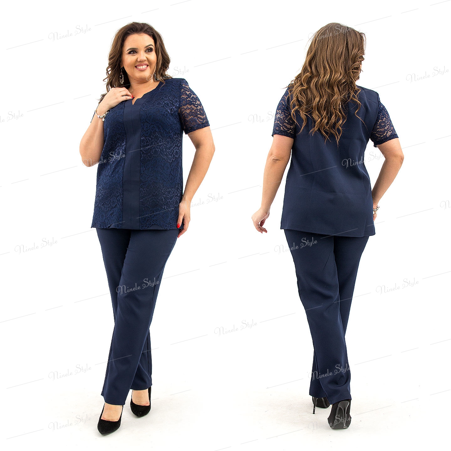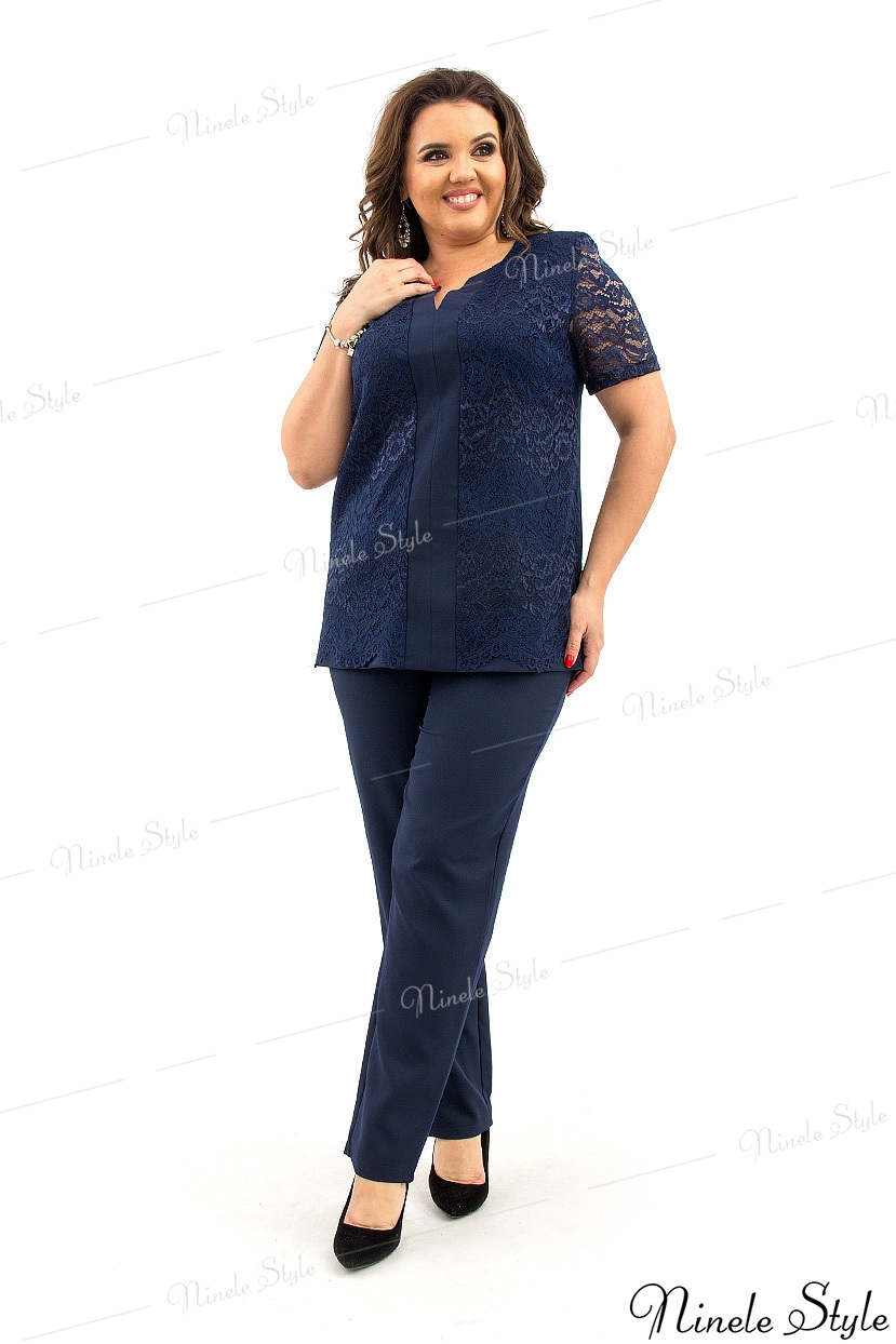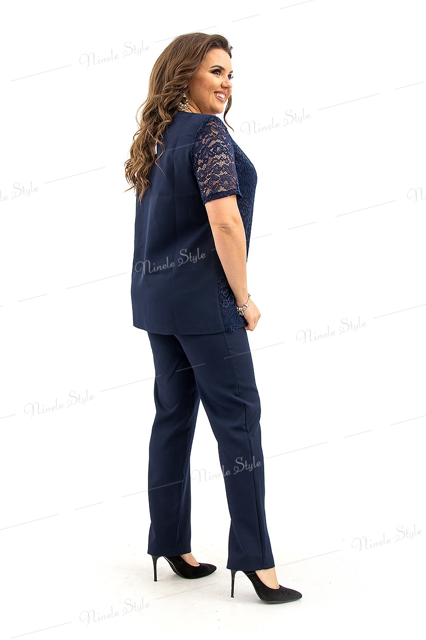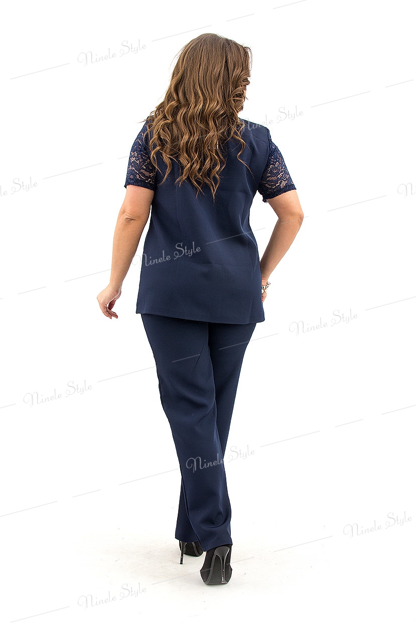 Костюм брючный женский, состоящий из брюк и блузки. Классические брюки имеют высокую посадку, заужены от середины бедра к низу. Модель на притачном поясе, с внутренней резинкой по бокам. По передней и задней части талевые вытачки. Спереди застежка на молнию с гульфиком. Длина по боковому шву 110 см, по внутреннему шву 80 см. Блузка полуприлегающего силуэта, Длина по среднему шву спинки 70 см. Нагрудные выточки выходят из проймы. По центру притачная планка со швом посередине. В верхней части шва обработан V-образный разрез.Рукава вточные, короткие.