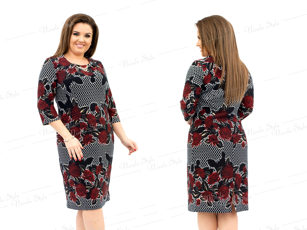 Платье женское прямого силуэта, длиной ниже колена. Предназначено для повседневной носки. Спинка с двумя талевыми вытачками, со средним швом и разрезом. Горловина круглая, обтачная,  без воротника. Нагрудные вытачки переведены в горловину. Рукав втачной, одношовный, длиной 3/4