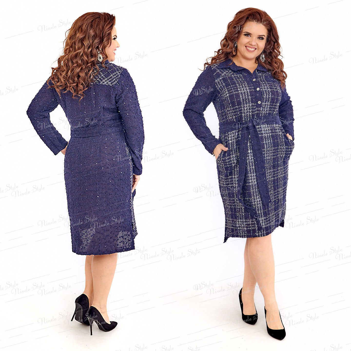 Платье-рубашка в  серебряную клетку выполнено из ткани букле. Спинка и рукав однотонные. На переднем полотнище выполнена кокетка. Воротник рубашечный. Рукав втачной, одношевный. Заднее полотнище чуть длиннее переднего. Платье под пояс.