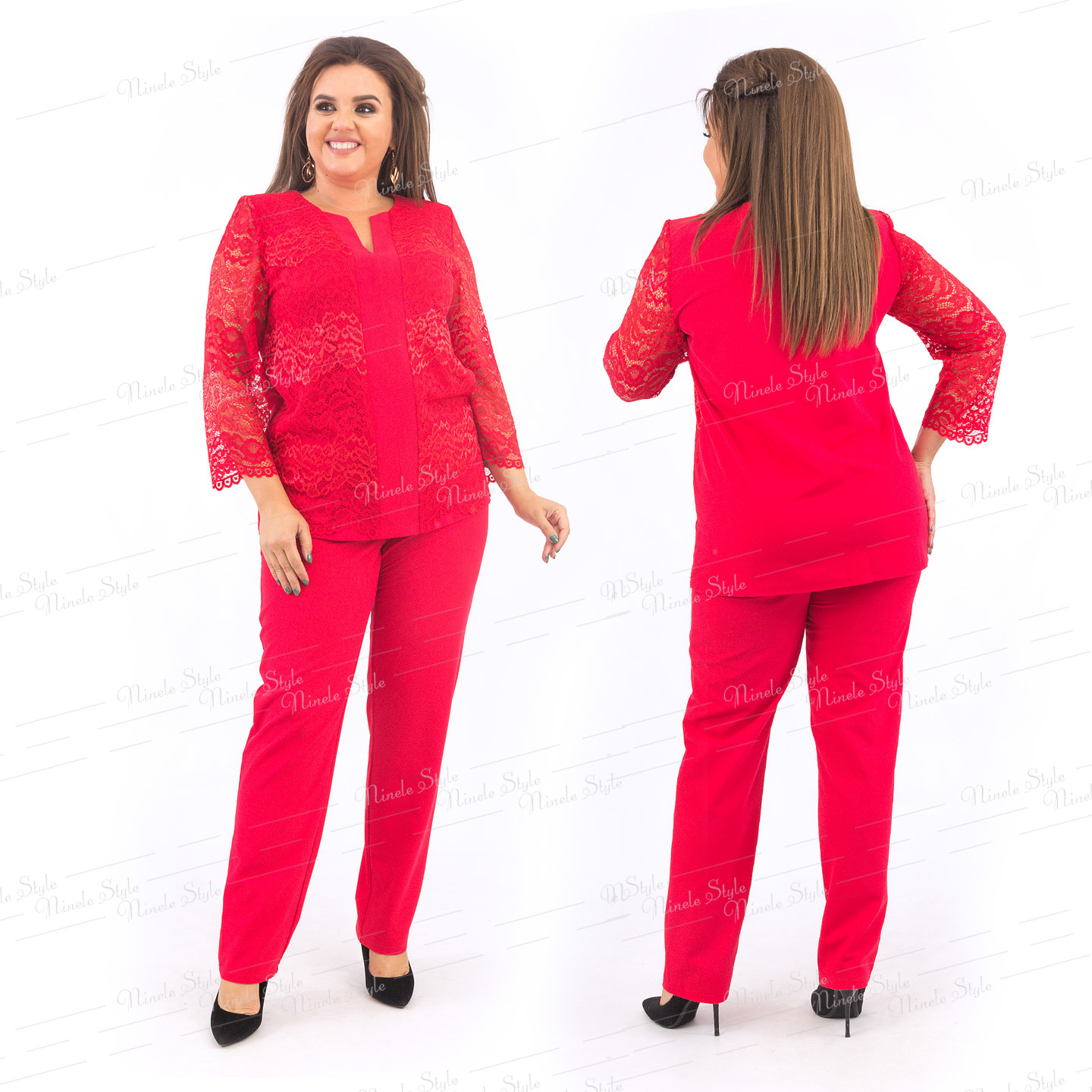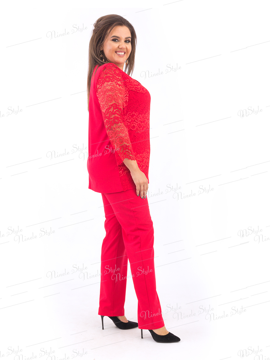Женский костюм красного цвета декорирован романтичным гипюром.