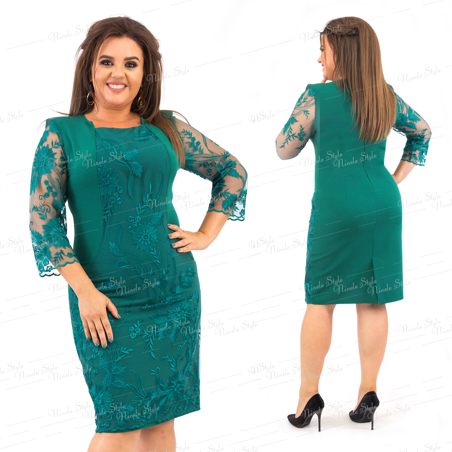 Элегантное женское платье полуприлегающего  силуэта, чуть зауженное книзу. Платье выполнено из двух видов ткани: основной-костюмной и отделочной сетки, что придает платью эффектный контраст. Рельефы на детали переда выходят из горловины, проходят через центр груди и плавно переходят в боковой шов по линии бедер. Спинка с талевыми выточками. В среднем шве расположена шлица. Горловина с уступами,что придает платью оригинальность. Рукава втачные, одношевные. Платье с плечевыми накладками. Идеальный выбор для любого праздничного мероприятия.