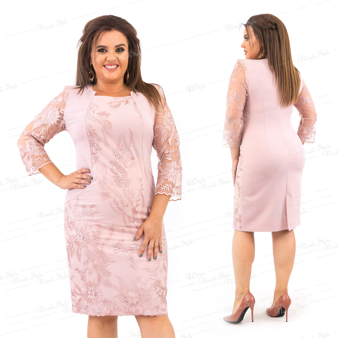 Элегантное женское платье полуприлегающего  силуэта, чуть зауженное книзу. Платье выполнено из двух видов ткани: основной-костюмной и отделочной сетки, что придает платью эффектный контраст. Рельефы на детали переда выходят из горловины, проходят через центр груди и плавно переходят в боковой шов по линии бедер. Спинка с талевыми выточками. В среднем шве расположена шлица. Горловина с уступами,что придает платью оригинальность. Рукава втачные, одношевные. Платье с плечевыми накладками. Идеальный выбор для любого праздничного мероприятия.