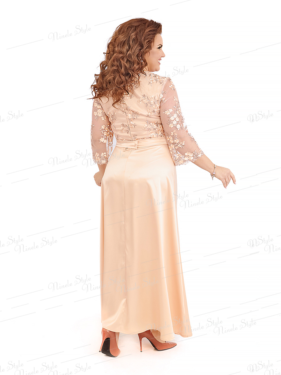 Модель 401 - это наряд с полуприлегающим силуэтом для торжества или особого случая. Платье отрезное по линии талии, с поясом, который застегивается на петлю и пуговицу. Детали лифа состоят из атласной ткани покрытой кружевной тканью. Нижняя деталь переда начинается выше уровня груди. Отделочные детали отлетные с фестонами покрывают частично деталь переда. В заднем среднем шве обработана застежка молния. Юбка длинная, расклешенная книзу. Рукава втачные, одношевные, слегка расклешенные книзу. В этом платье вы будете звездой на любой вечеринке.