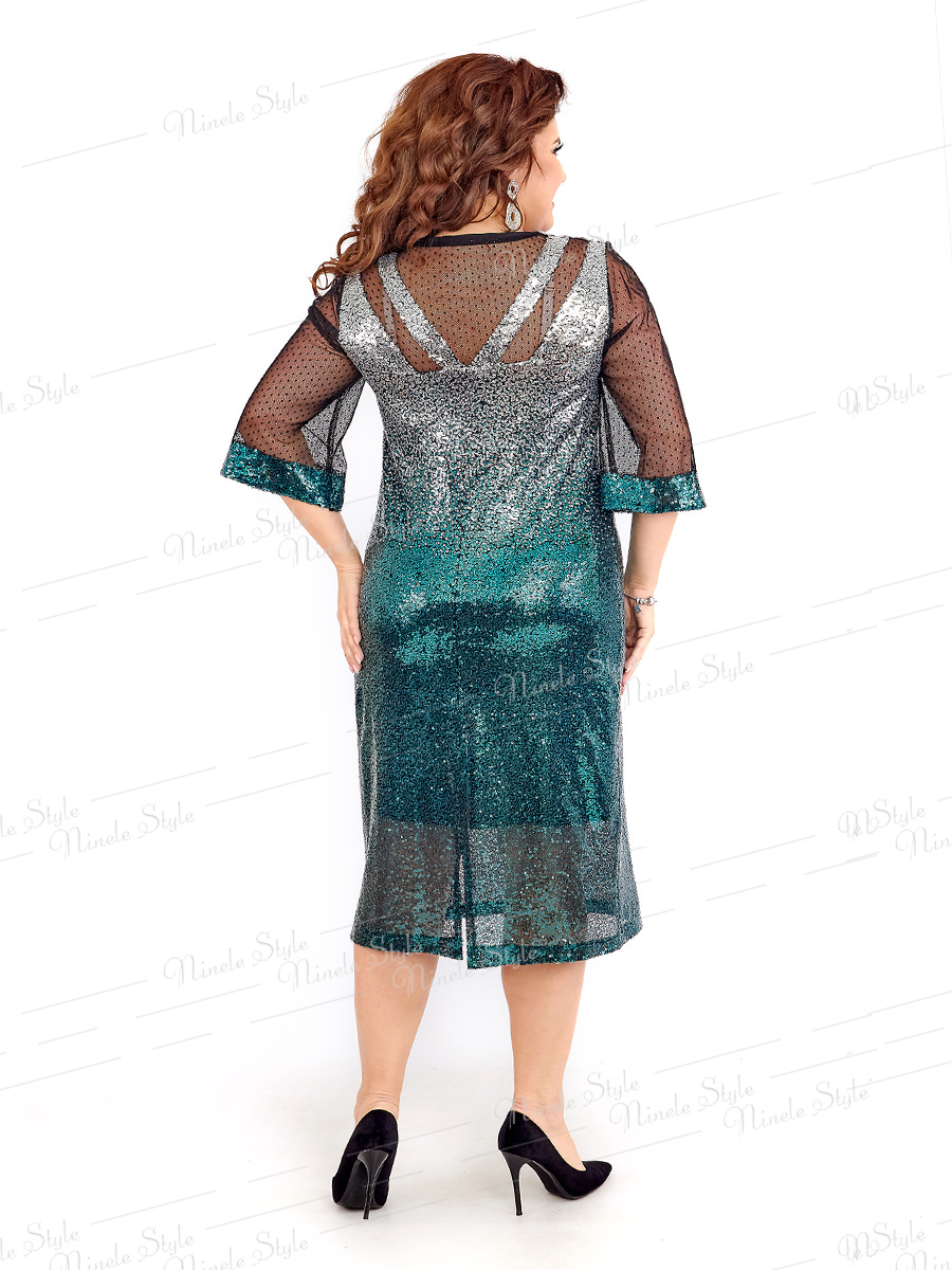 Нарядное  зеленое платье с блестками  лучший выбор для праздника, вечеринки, дискотеки. В этом платье Вы не останетесь незамеченной, гармонично подчеркнет Вашу грацию. Смотрится очень достойно! Платье выполнено из пайеточной ткани. Силуэт платья полуприлегающий, впереди расположены нагрудный выточки, горловина V-образной формы, по спинке выполнены талевые выточки,  рукав втачной, расширен к низу и обработан по краю основной ткани.