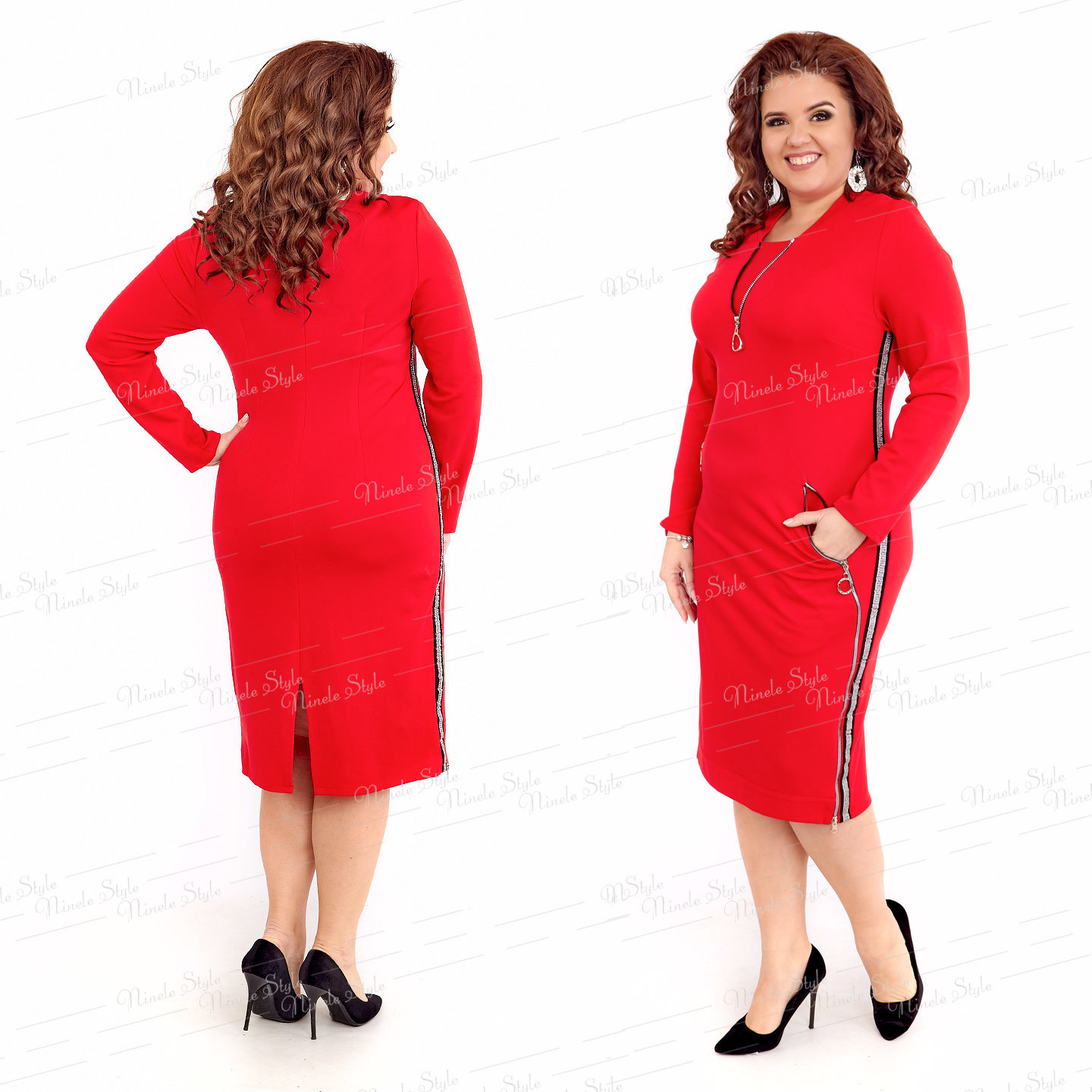 Восхитительное красное платье прямого силуэта из трикотажного полотна в спортивном стиле. Вырез горловины круглый с воротником стойко прилегающим к шее. В верхней части переда выполнены нагрудные выточки. В боковые швы вставлены серебряные лампасы. По переду от низа платья вставлена декоративная молния так же серебряного цвета, переходящая в карман. Молния открывается как снизу, так и сверху. Чудесный выбор для деловой женщины.