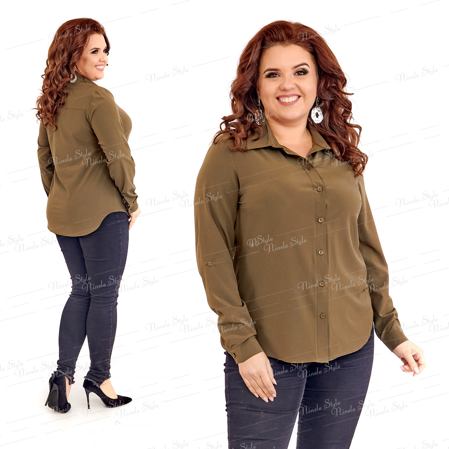 Оригинальная  женская блузка  цвета хакки подойдет как на выход, так и на праздник. Ткань стрейчевая, блузочная. Блузка полуприлегающего силуэта. Горловина овальная, с небольшим плосколежащим  воротником. Рукав длинный собран на манжету. Впереди планка застегивающаяся на пуговицы. Карманы отсутствуют.
