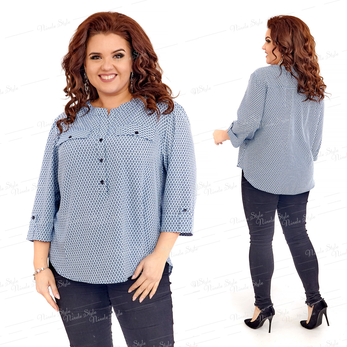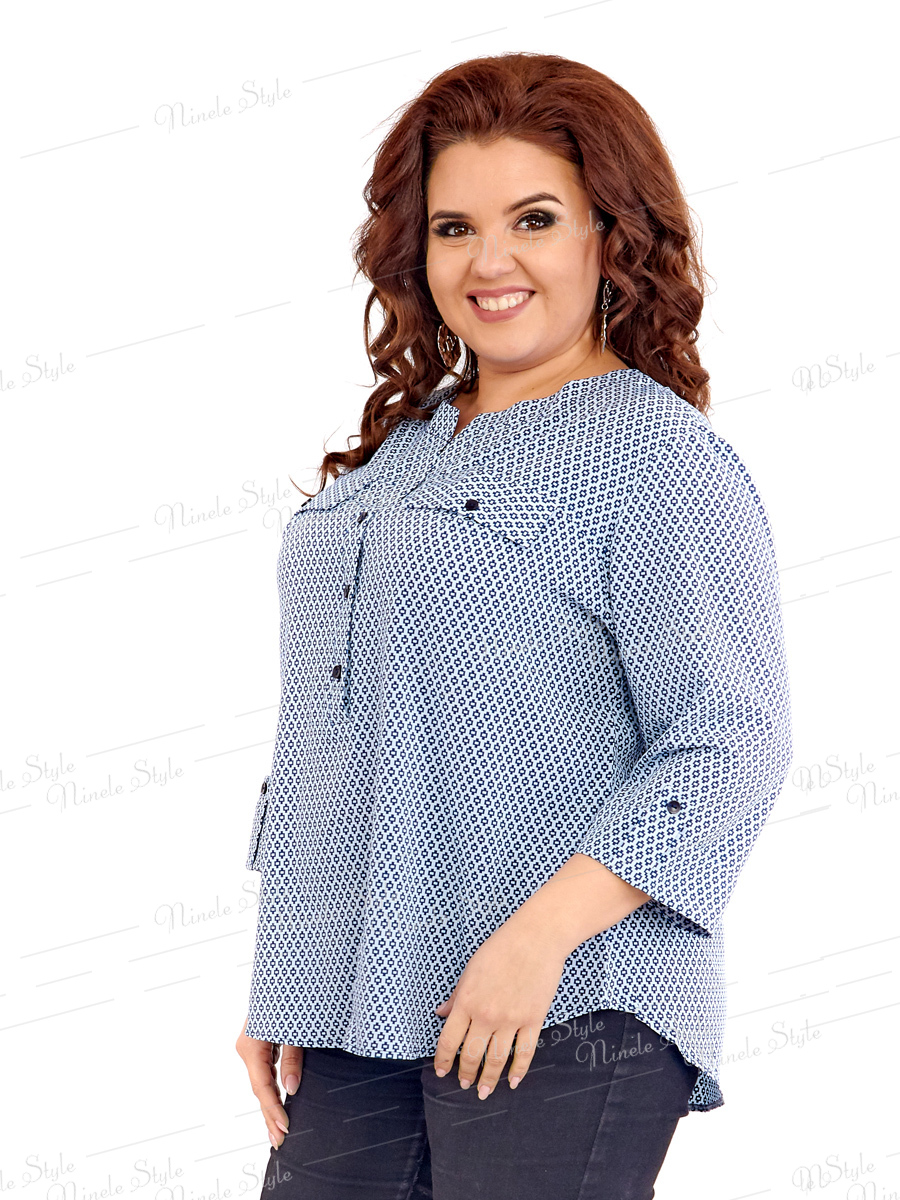 Оригинальная  женская блузка  подойдет как на выход, так и на праздник. Ткань стрейчевая, блузочная. Блузка полуприлегающего силуэта. Горловина овальная, без воротника. Впереди кокетка. Под кокетку вшиты клапаны. До середины переднего полотнища вшита планка, которая застегивается на пуговицы. Рукав 3/4, снизу рукава пришит патик , украшеный пуговицей. Низ блузки закруглен.