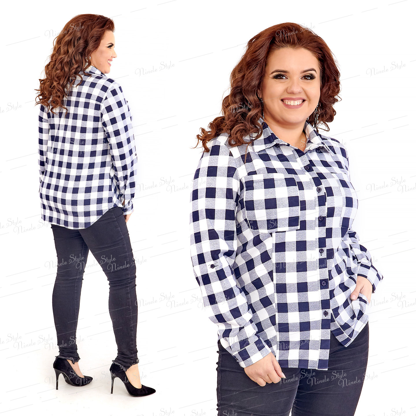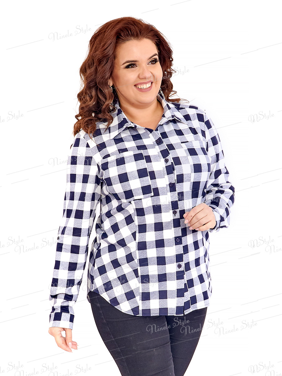 Оригинальная  женская блузка в  клетку  подойдет как на выход, так и на праздник. Ткань  французский трикотаж. Блузка полуприлегающего силуэта. Горловина овальная, с небольшим воротником на стойке. Рукав длинный сбран на манжету. Впереди  рельефы. Рисунок  боковых деталей выложен по косой. По центру переда  планка застегивающаяся на пуговицы. С двух сторон  нагрудные  карманы.