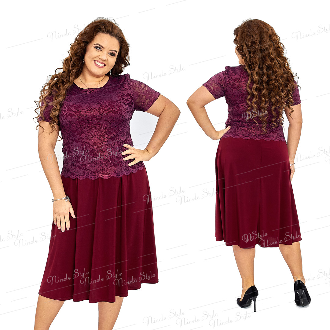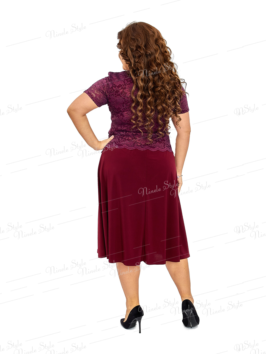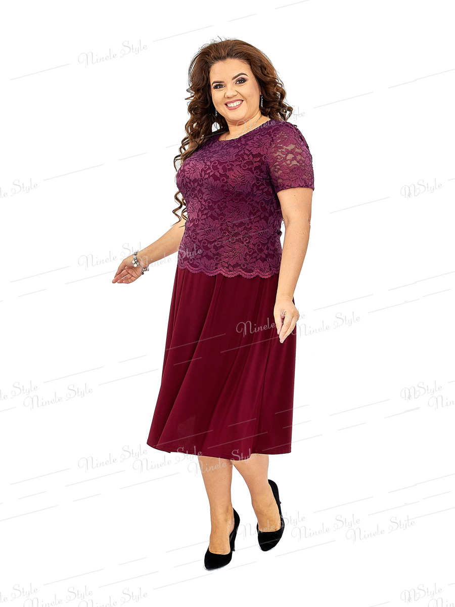 Стильное вечернее платье  баклажанового цвета. Платье выполнено из двух видов ткани. Платье отрезное по линии талии. Юбка расклешенная. Лиф двухслойный. Внутренний слой из масла, а верхний из нежного гипюра с напылением. Рукав короткий, одношевный.