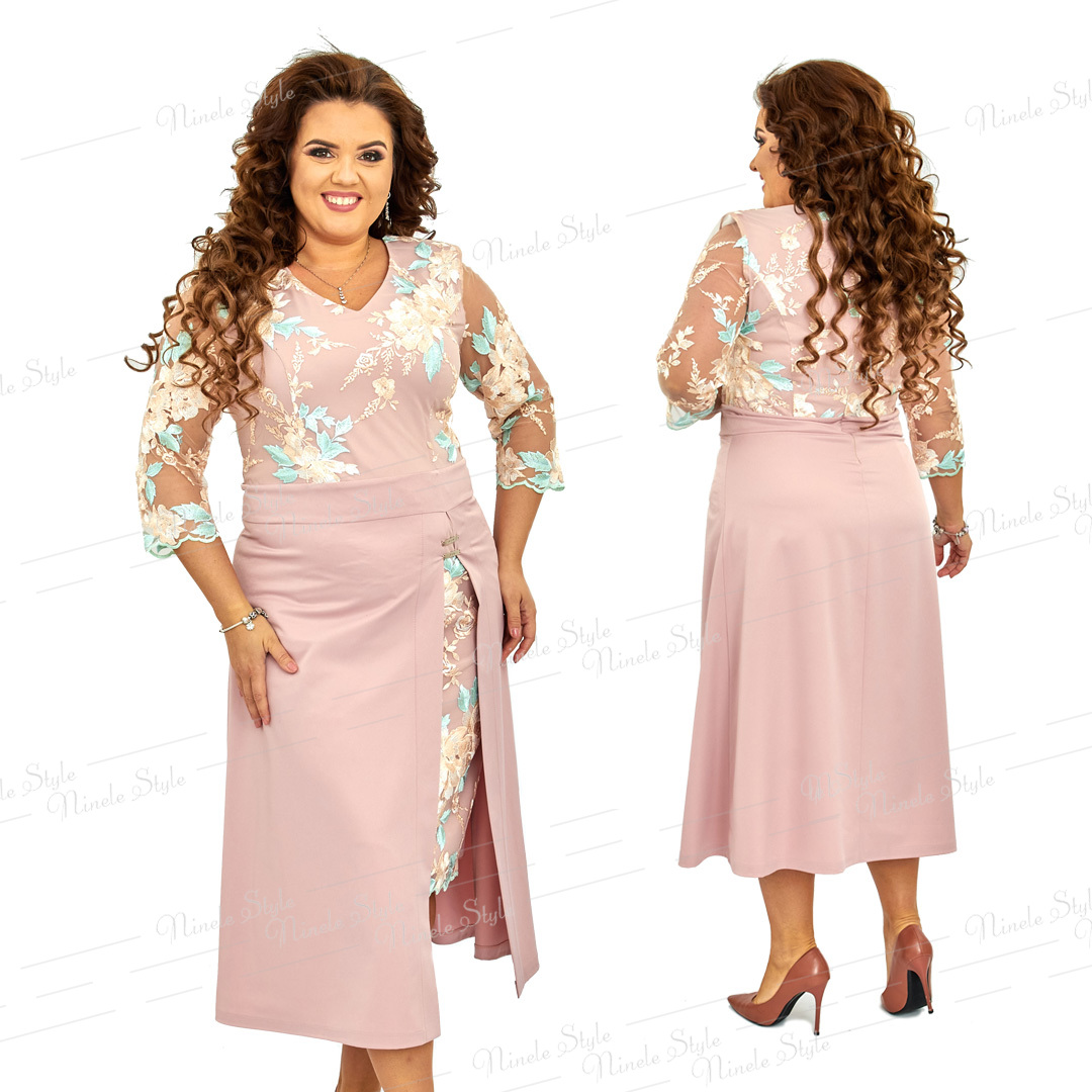 Нарядное женское платье прилегающего силуэта. Выполнено из однотонной костюмной ткани и роскошной сетки с вышивкой. Лиф отрезной по линии талии с рельефами. Горловина V образной формы, обработана обтачкой. Нижняя часть платья состоит из верхней расклешенной, длинной юбки. А так же из нижней юбки - прилегающей укороченной из сетки с вышивкой. Передняя часть длинной юбки состоит из двух частей. Рукав 3/4 из сетки. Спинка и перед покрыты сеткой. В среднем шве спинки вшита потайная молния. Сетка и костюмная ткань подобраны по тону.