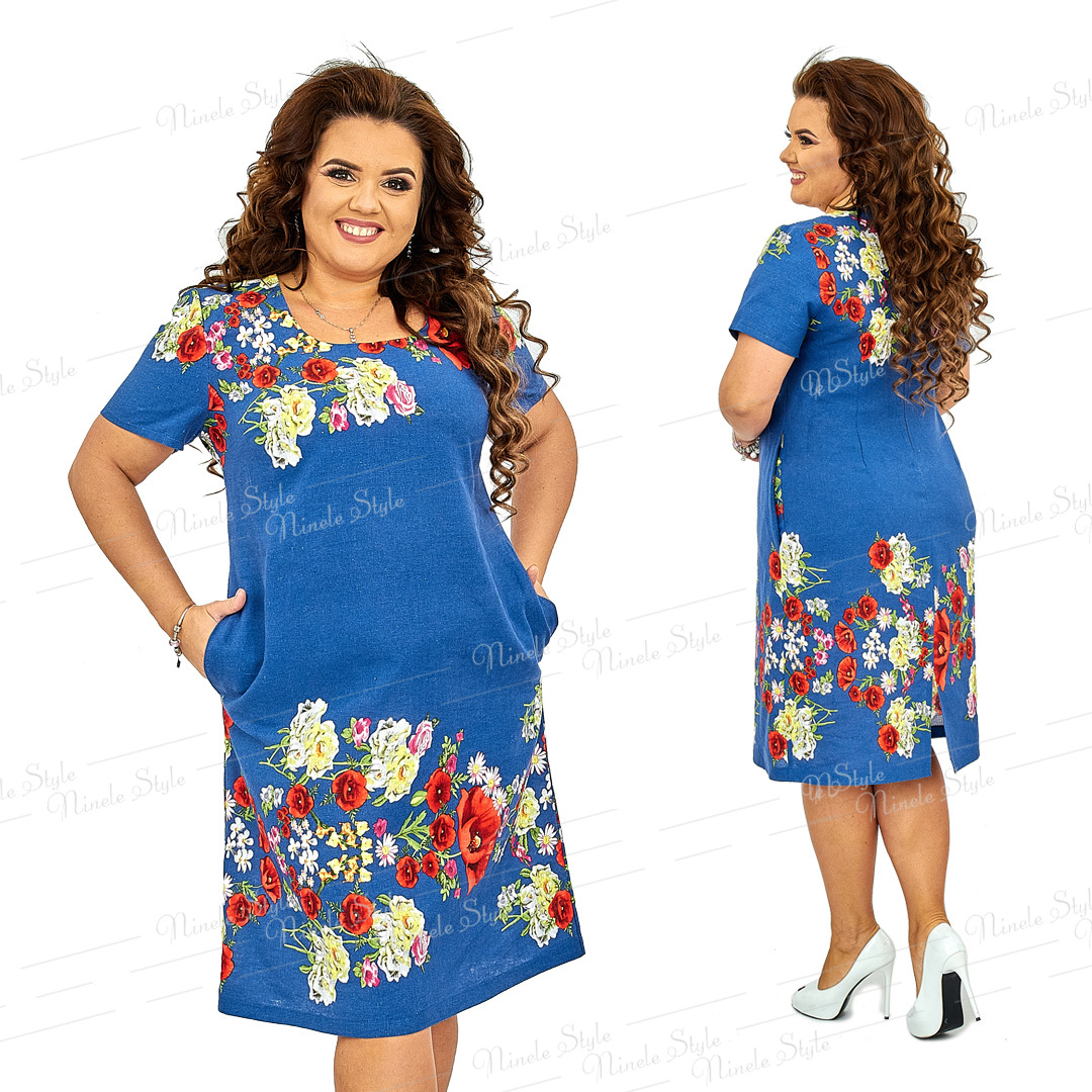 Великолепное льняное платье с оригинальным принтом украсит образ любой женщины. Платье имеет трапецевидную форму. Спереди платья выполнены нагрудные выточки. В боковых швах карманы. Спинка со средним швом и талевыми выточками. В средний шов спинки вшита  застежка-молния. Горловина круглая, углубленная обработана обтачкой. Рукав короткий, втачной.