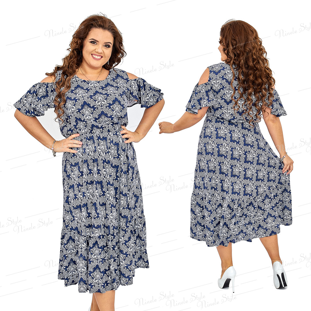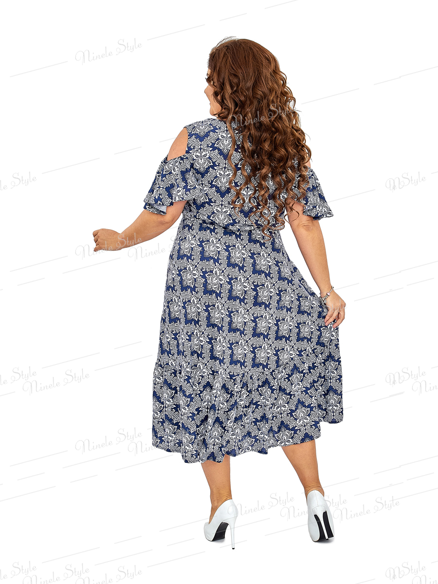 Летнее платье с цветочным принтом, подойдет для повседневной носки. Платье отрезное по линии талии. В шов вшита резинка. Горловина круглая, обработана обтачкой. Рукава с открытой линией плеча. Юбка трапецевидная, снизу пришит валан.