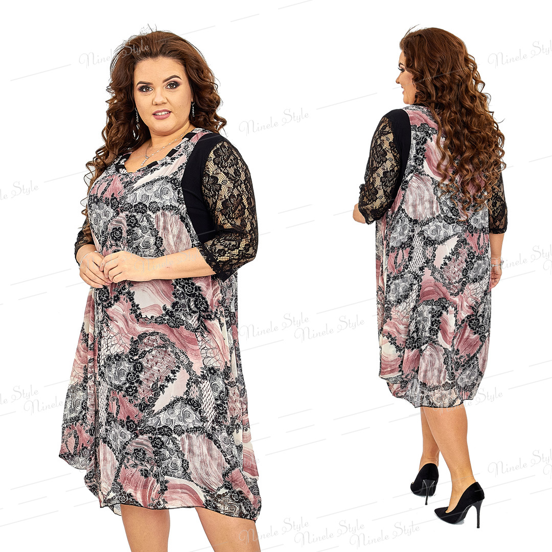 Шифоновое платье  свободного кроя скроет все недостатки фигуры.Нижнее платье из трикотажа "масло" прямого покроя .Шифоновая часть платья выполнена в виде сарафана .Платье расширено к низу.Низ платья заложен в фалды.Горловина круглая,Рукав вточной,одношевный.