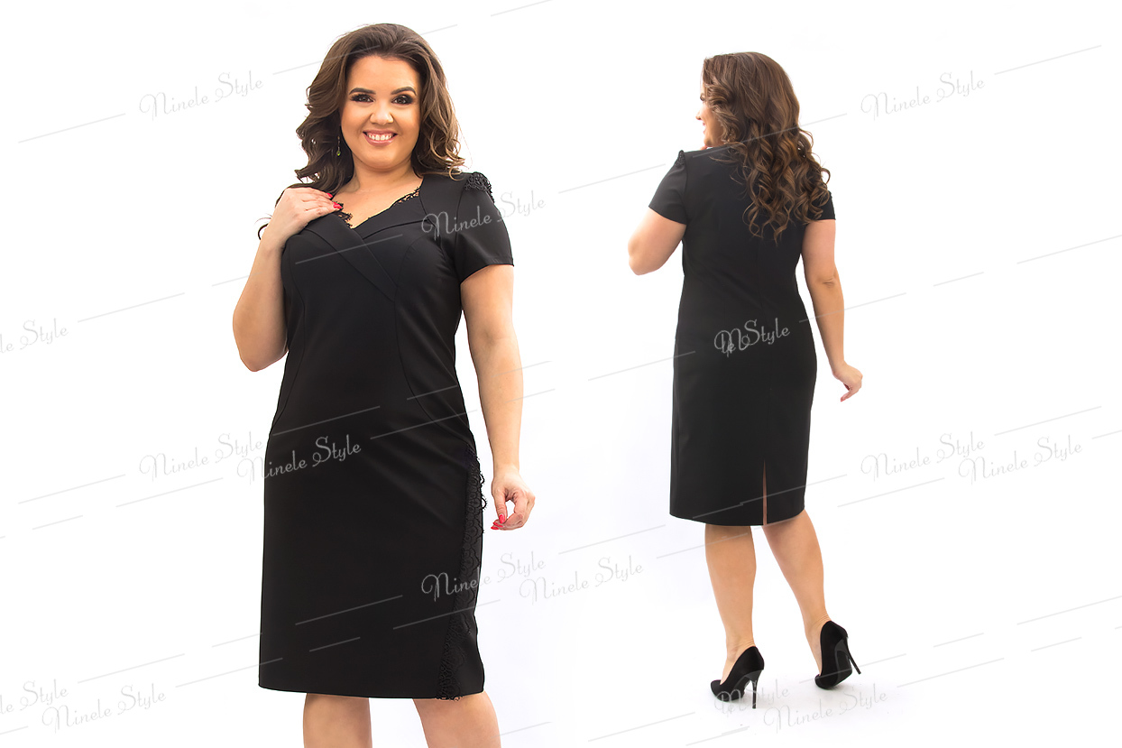 Стильное платье черного цвета выглядит нарядно и эффектно. Спинка платья цельнокроенная, с талевыми выточками. В средний шев спинки вставлена молния. Перед платья  с подрезом под грудью. Горловина обработана воротничком. По левой ноге сделан подрез в который вставлено черное кружево.