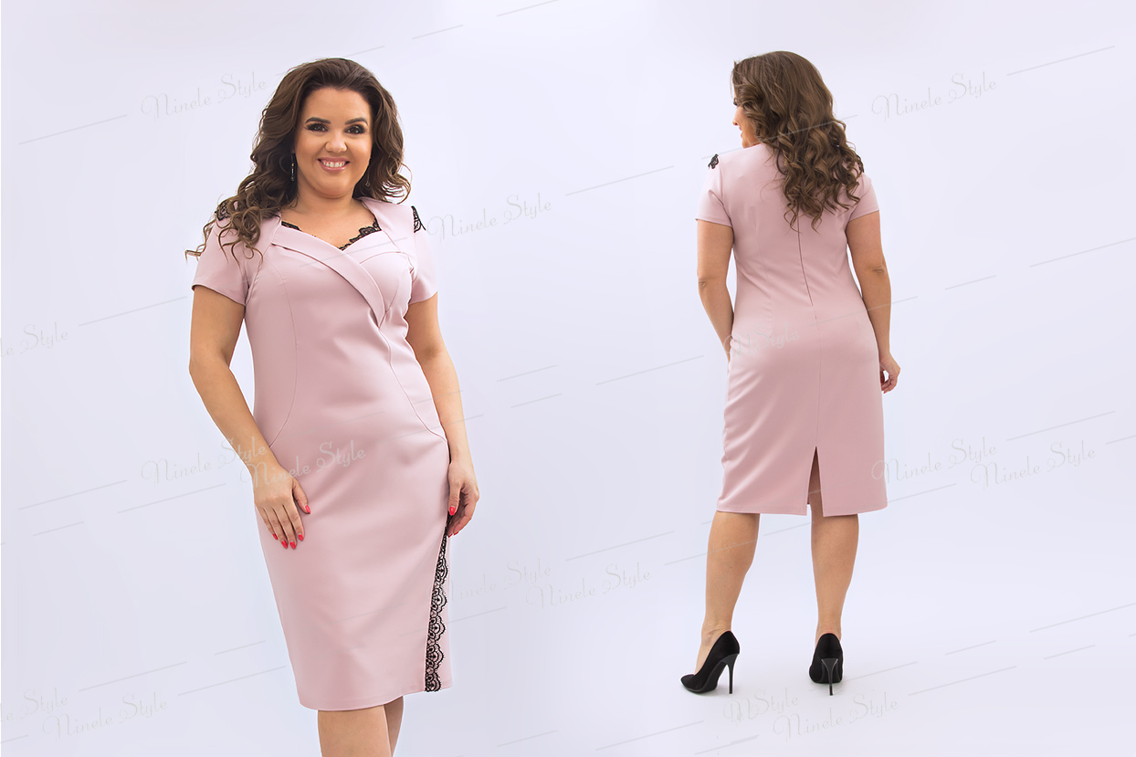 Стильное платье бежевого цвета выглядит нарядно и эффектно. Спинка платья цельнокроенная, с талевыми выточками. В средний шев спинки вставлена молния. Перед платья  с подрезом под грудью. Горловина обработана воротничком. По левой ноге сделан подрез в который вставлено черное кружево.