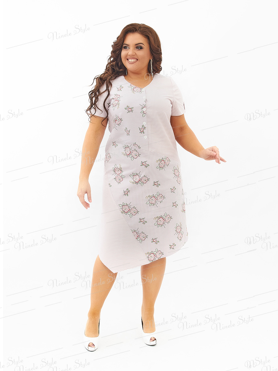 Повседневное платье с оригинальным принтом и особенным кроем.Спинка платья состоит из двух частей. Верхняя часть в  вертикальную полоску,а нижняя в продольную.Горловина платья круглая.Застежка на пуговицы до подреза.На правой ноге подол платья  в виде угла.Рукав вточной,одношовный.