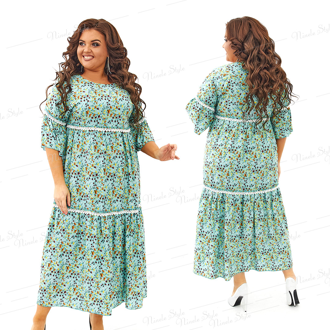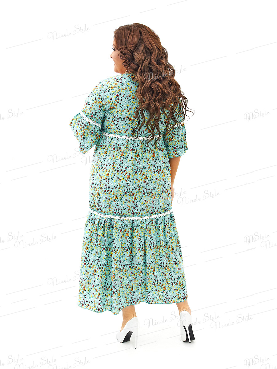 Платье в стиле бохо выполнено из штапельной ткани. Платье отрезное под грудью. Лиф платья с цельнокроеным рукавом. Из под груди два волана в сборку. Каждая часть волана отделана кружевом.