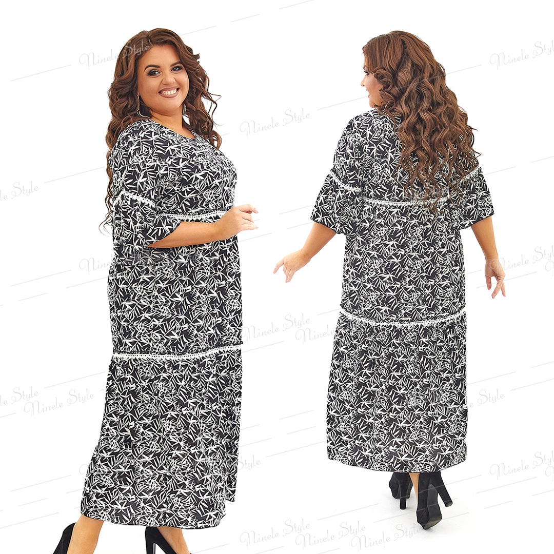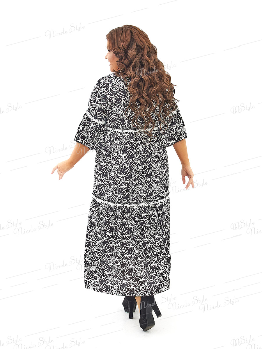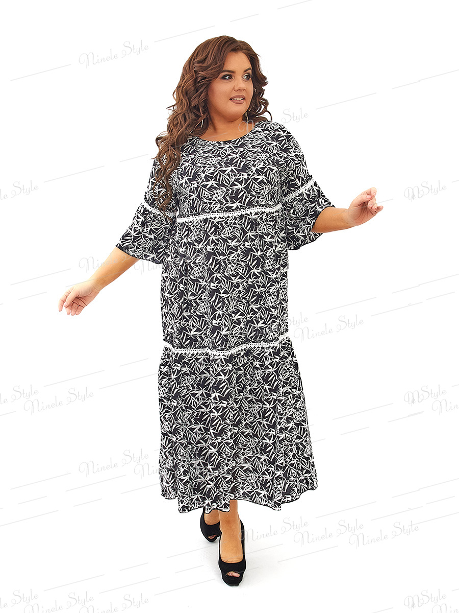 Платье в стиле бохо выполнено из штапельной ткани. Платье отрезное под грудью. Лиф платья с цельнокроеным рукавом. Из под груди два волана в сборку. Каждая часть волана отделана кружевом.