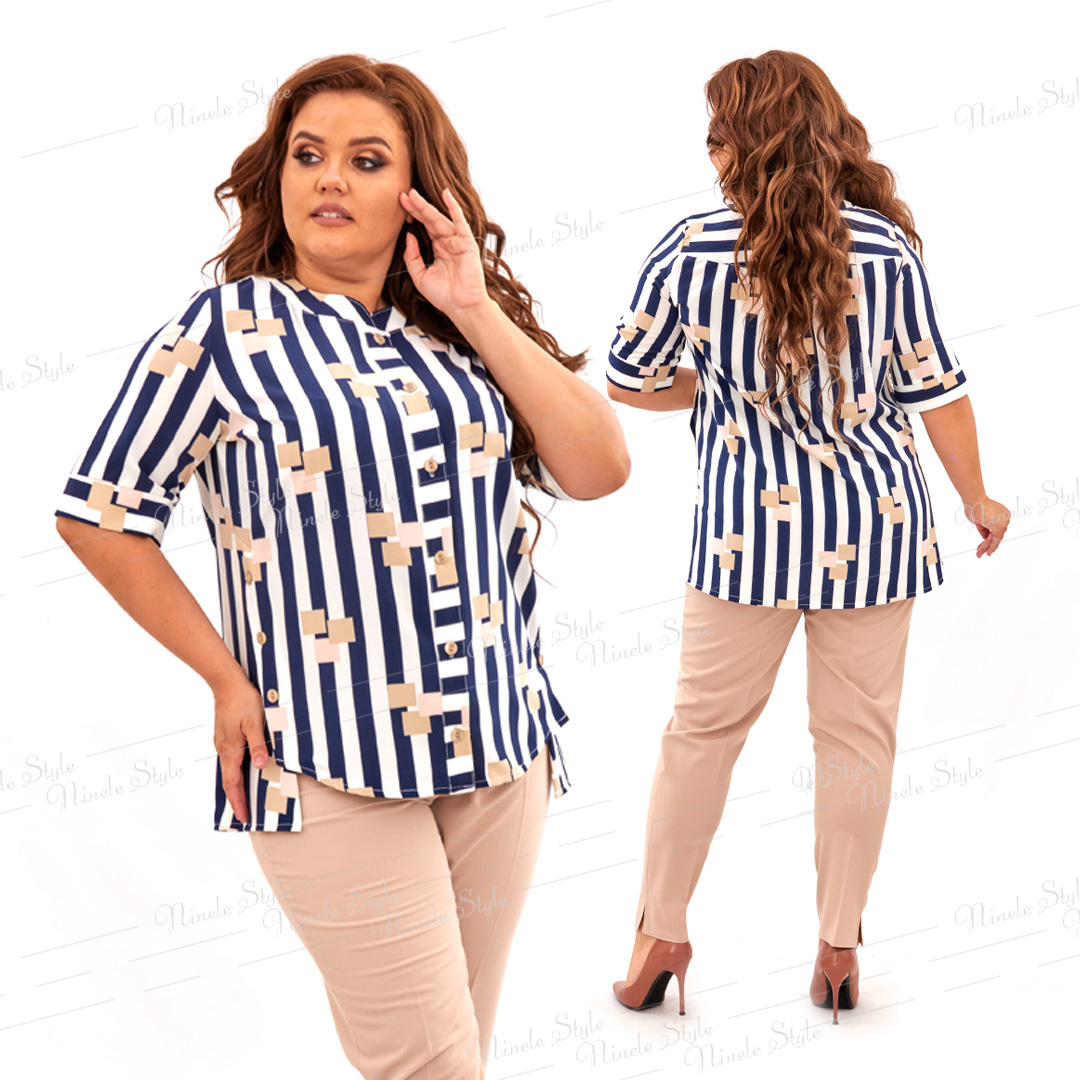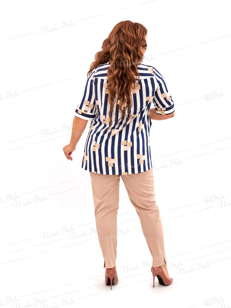 Женский брючный костюм.Брюки выполнены из ткани стрейч-тиар,блуза  шелк-пума.Брюки с высокой посадкой, заужены к низу,по бокам  внизу небольшие разрезы.На поясе по бокам резинка.Блуза свободного кроя,воротник стойка,рукав с манжетом. В переди вертикальная планка с пуговицами.Полочка немного короче спинки.По бокам блуза декорирована пуговицами.