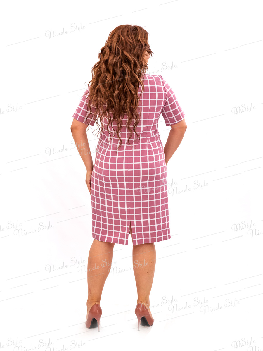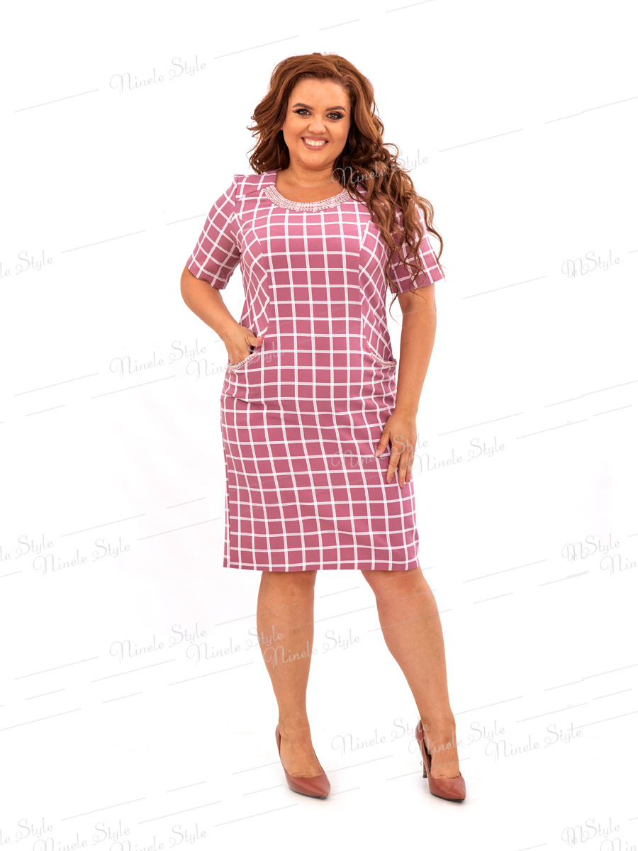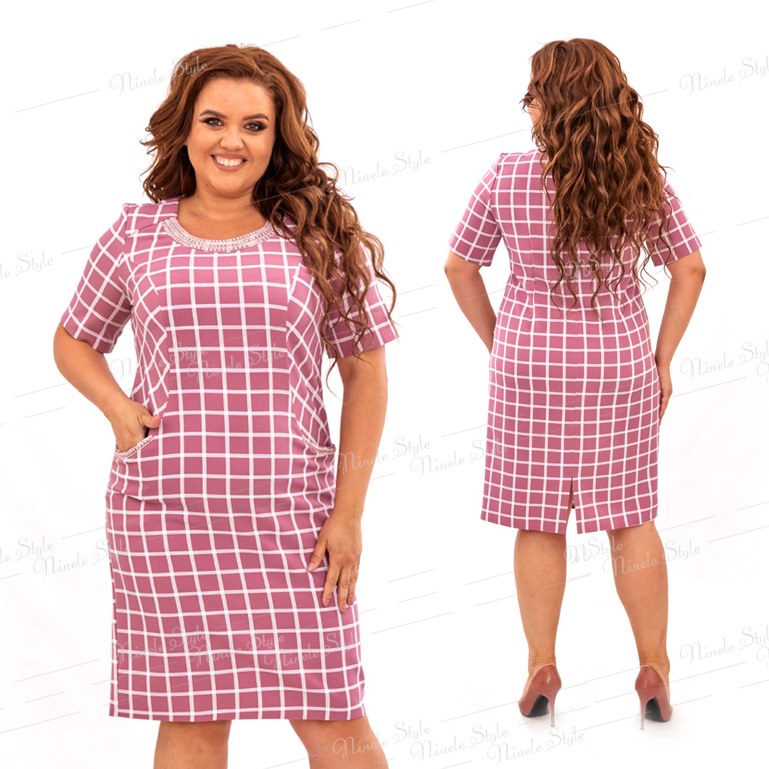 Нарядное женское платье приталенного силуэта.Выполнено из ткани в клетку с рельефами по груди.На полочке карманы декорированные камнями.Круглая горловина обработана обтачкой.
