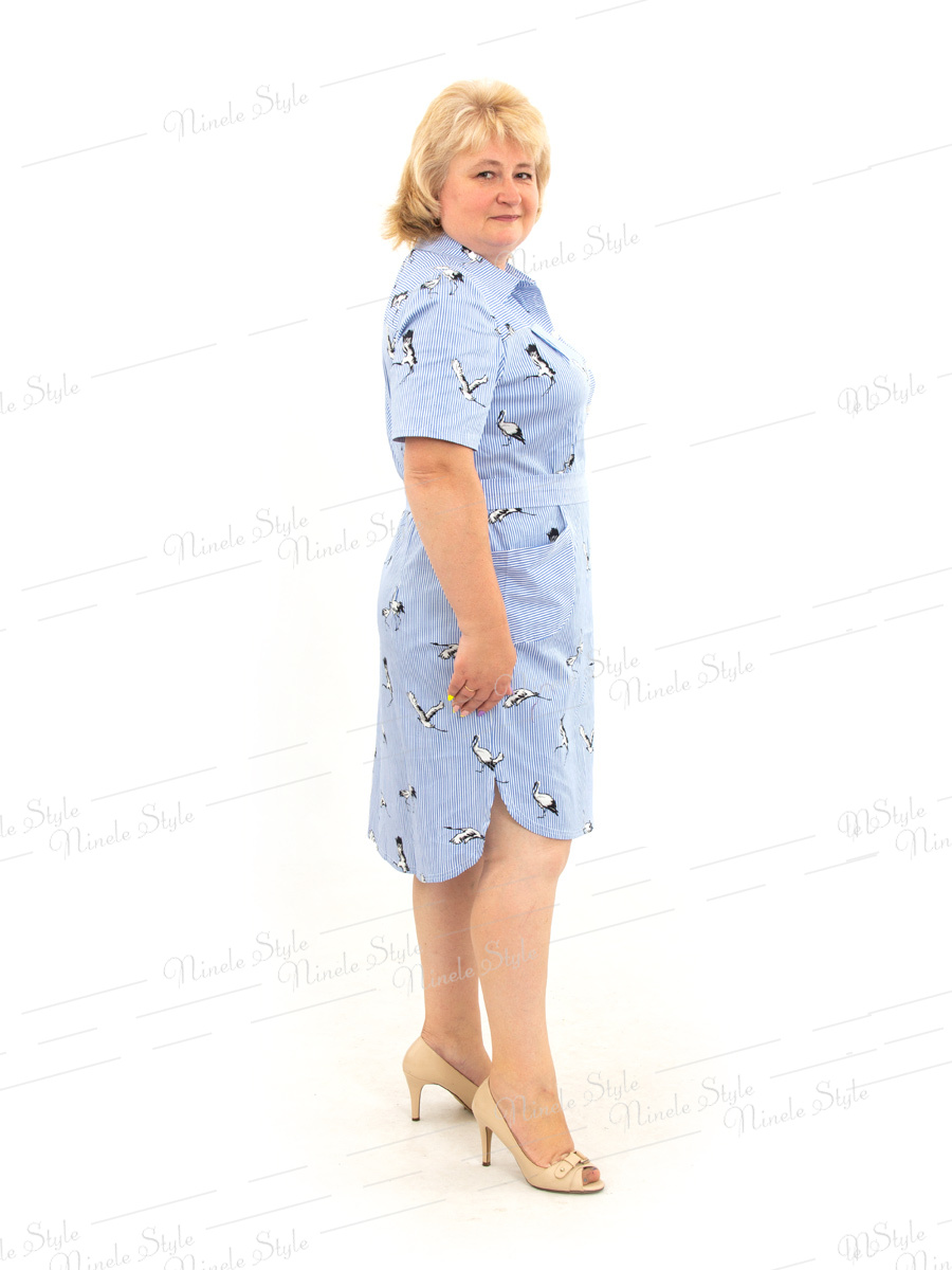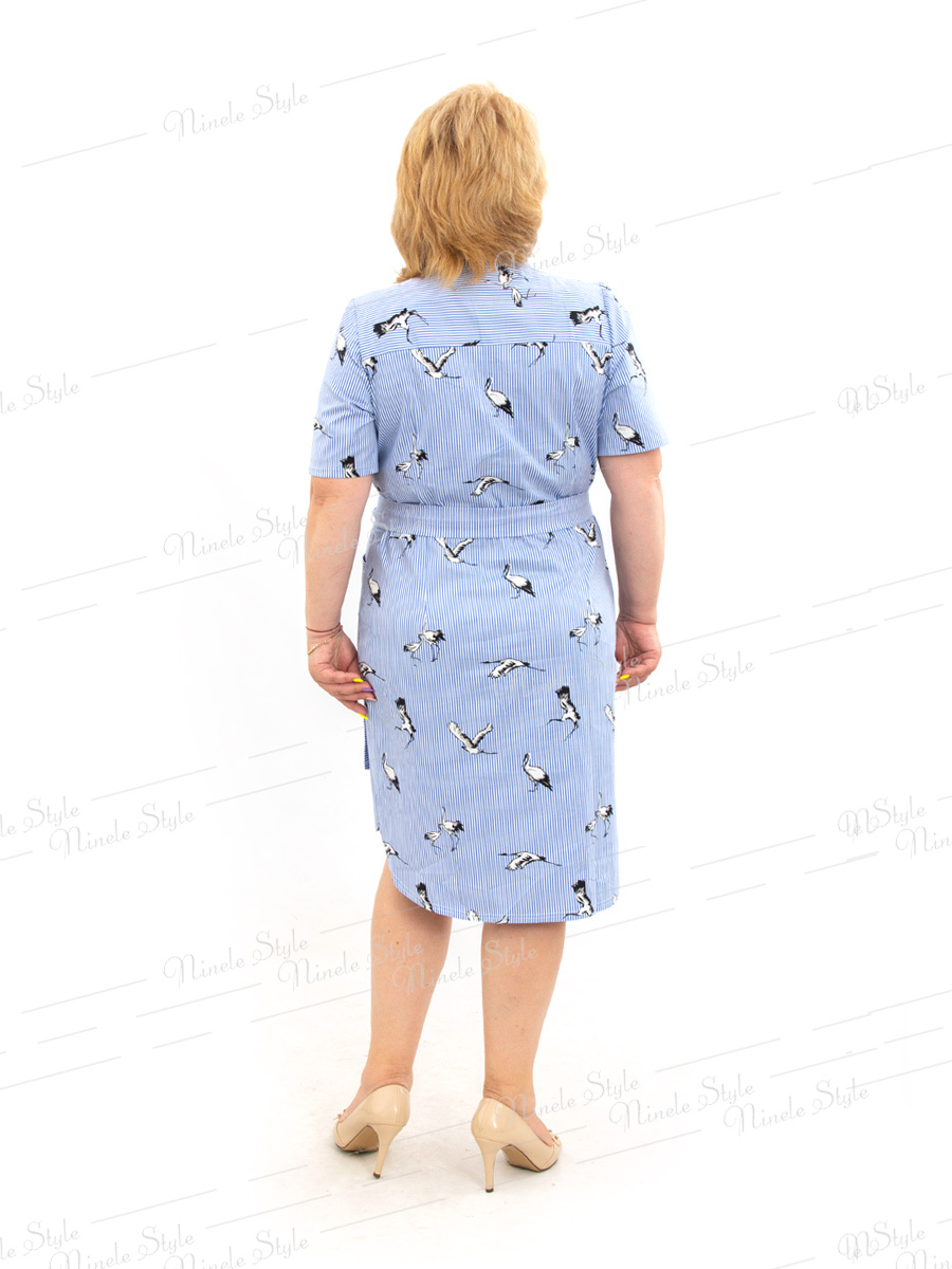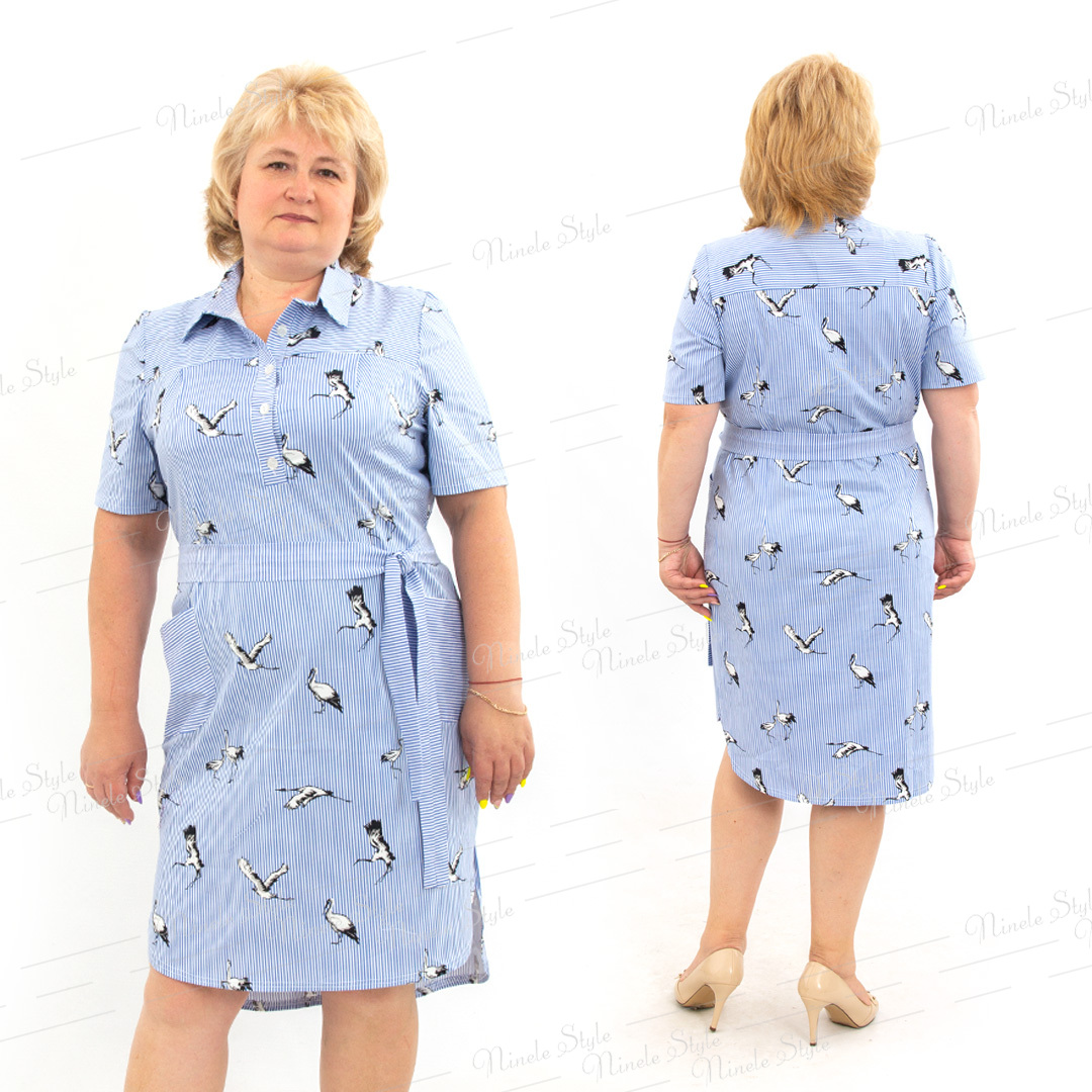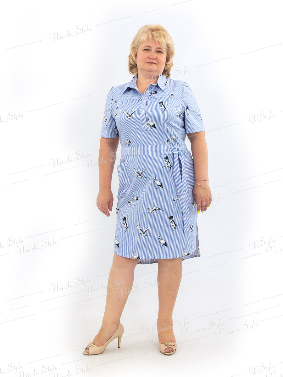 Женская платье-рубашка прямого силуэта.Выполнено из коттоновой ткани.На спинке изделия приточная кокетка.На полочке кокетка.Карманы в боковых швах.Рукав короткий,вточной одношовный. Планка на пуговицах до центра груди.Воротник рубашечный на стойке.Пояс прилагается.