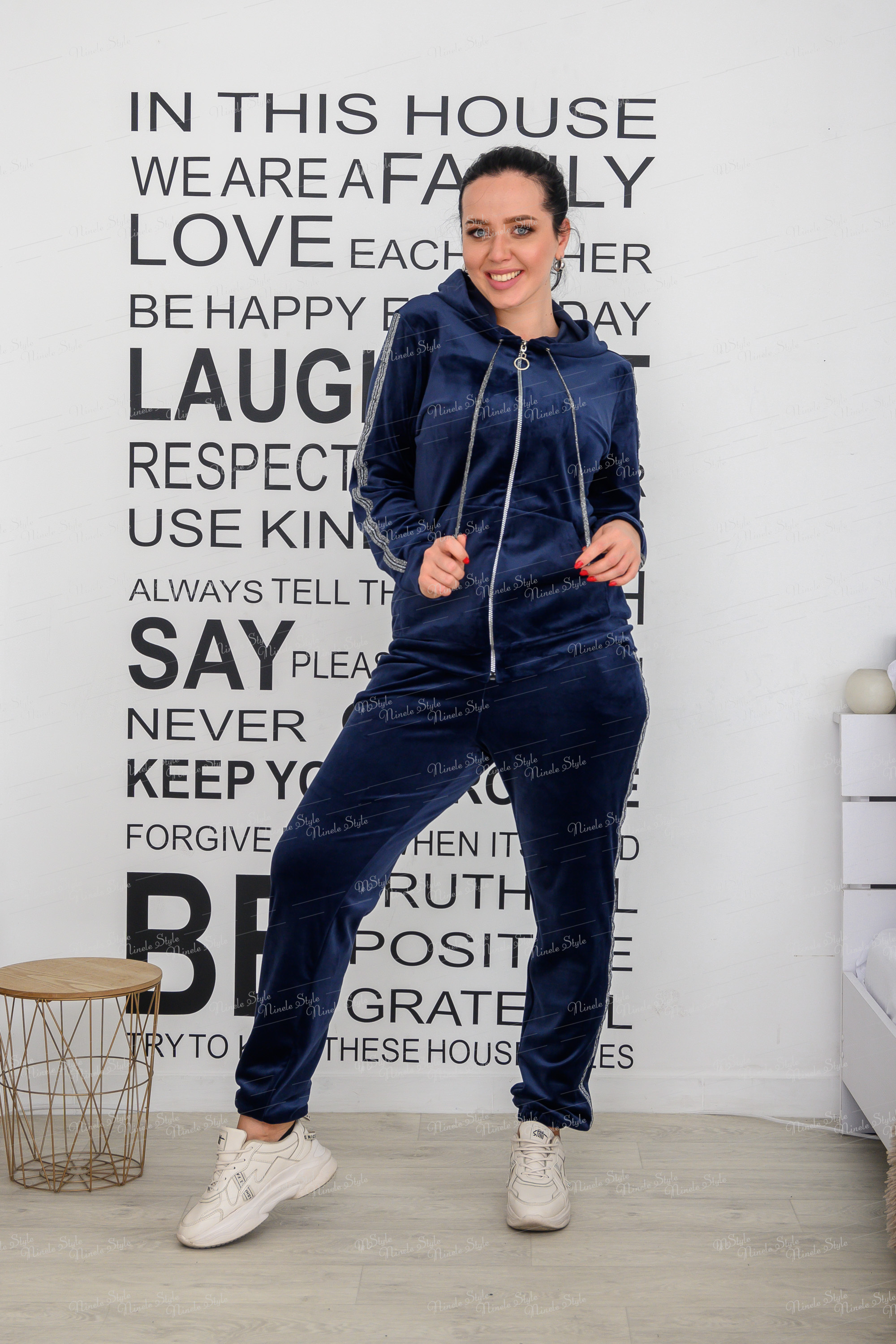 Костюм спортивный из мягкой велюровой ткани, состоит из джемпера и брюк. Джемпер свободного силуэта. Впереди функциональная застежка молния и функциональные карманы " кенгуру". Рукав декорирован тесьмой. Снизу рукава манжет. Джемпер с капюшоном. Брюки прямого силуэта. В подрезном бочке переднего полотнища карманы. По боковым швам брюк декоративная тесьма. На талии брюк пояс со шнурком. Снизу брюк притачная манжета.