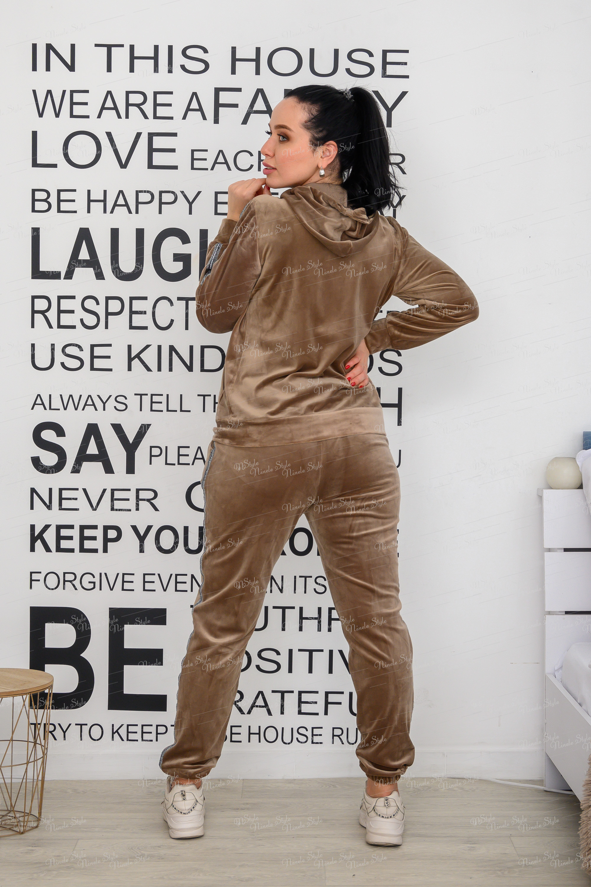 Костюм спортивний з м'якої велюрової тканини, складається з джемпера та штанів. Джемпер вільного силуету. Попереду функціональна застібка блискавка та функціональні кишені "Кенгуру". Рукав декорований тасьмою. Знизу манжет рукава. Джемпер з капюшоном. Штани прямого силуету. У підрізному бочку переднього полотнища кишені. По бічних швах брюк декоративна тасьма. На талії штанів пояс зі шнурком. Знизу штанів приточна манжета.