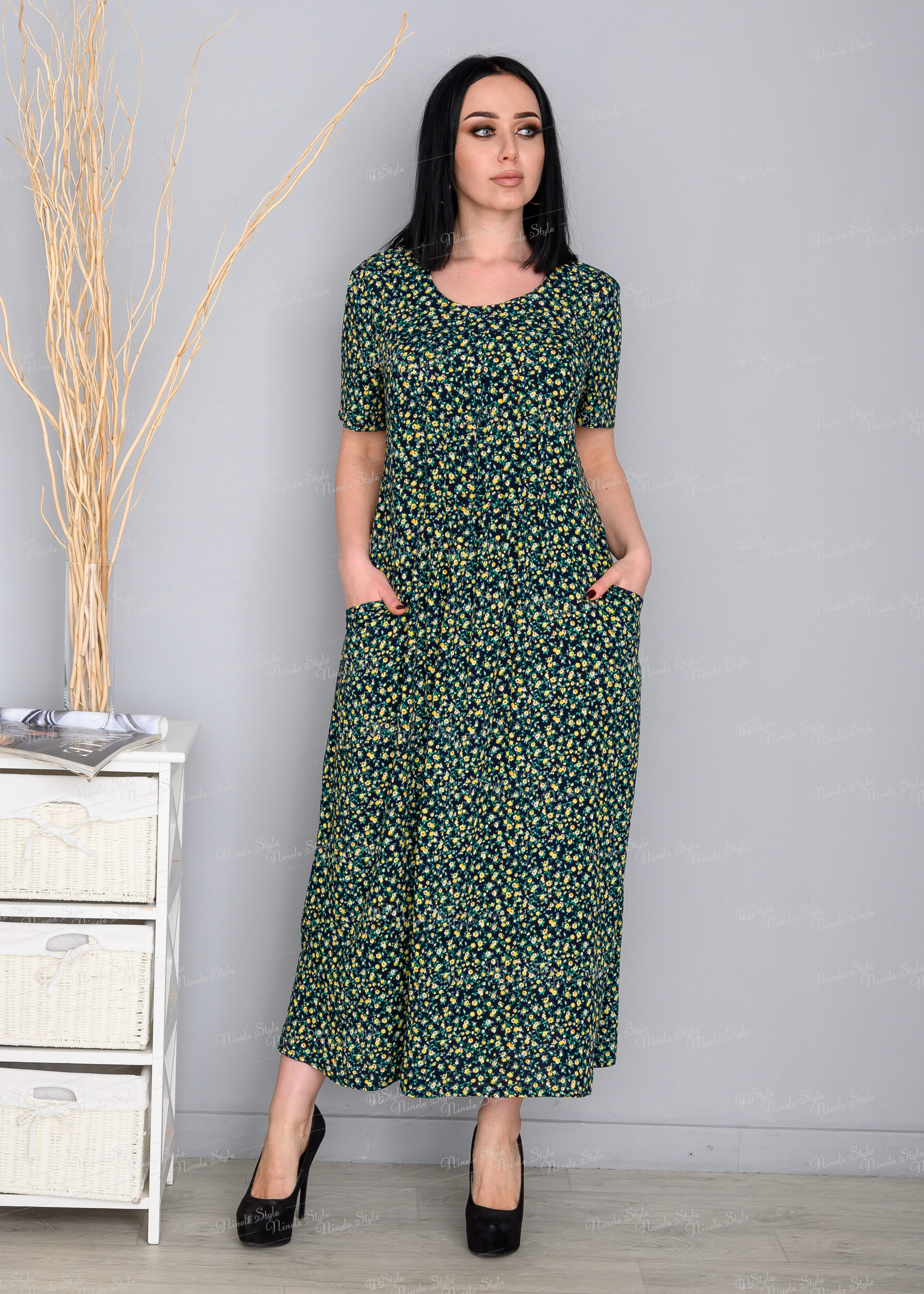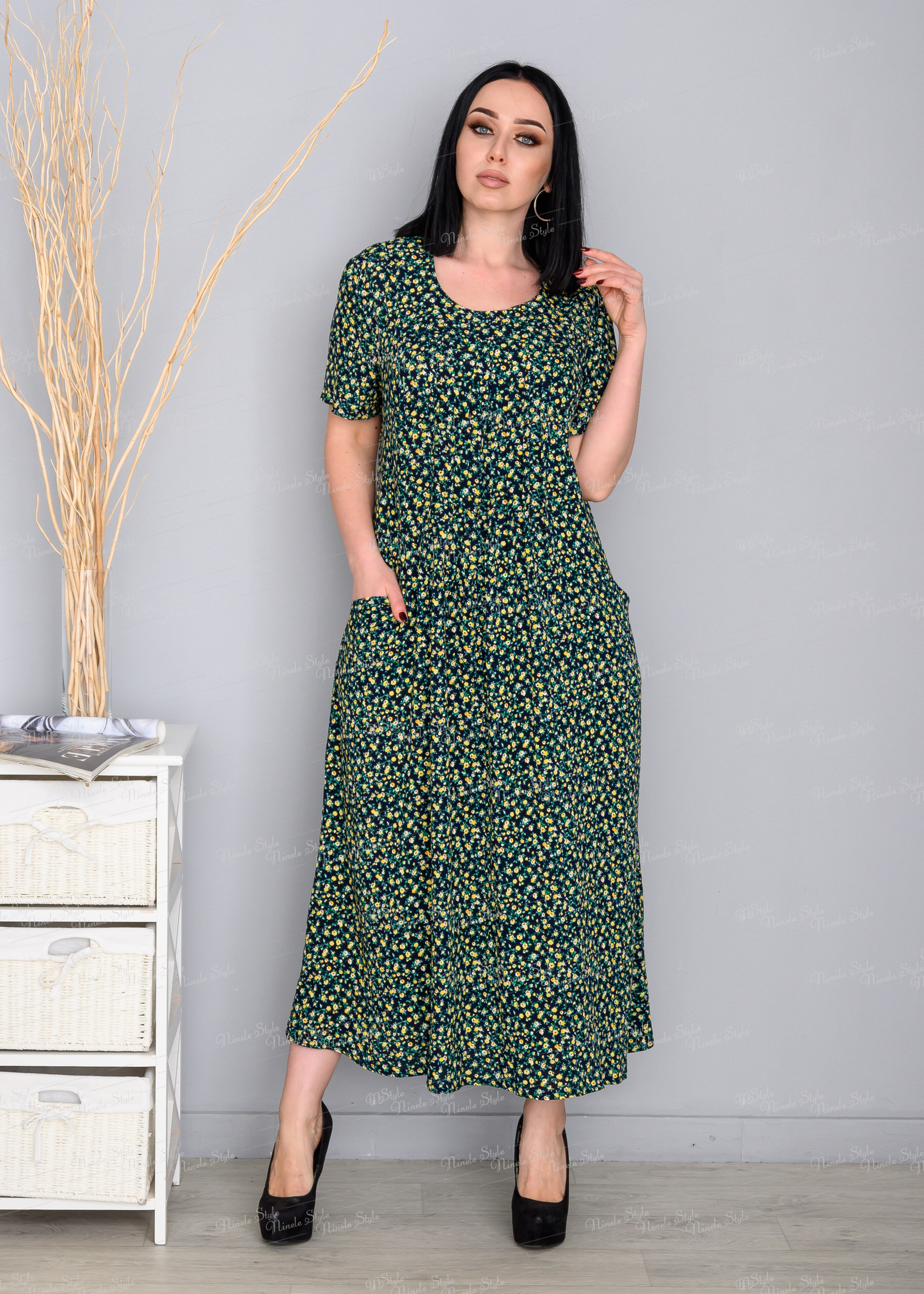 Сукня жіноча призначена для повсякденного носіння. Сукня розширена донизу,довга. Перед з відрізною кокеткою, з відрізними бочками. Центральна частина переда з 8-ма декоративними складками. У швах з'єднання бочків з центральною частиною переда оброблені кишені. Спинка із середнім швом.Горловина кругла, обтічна. Рукав втачний, короткий, одношовний.