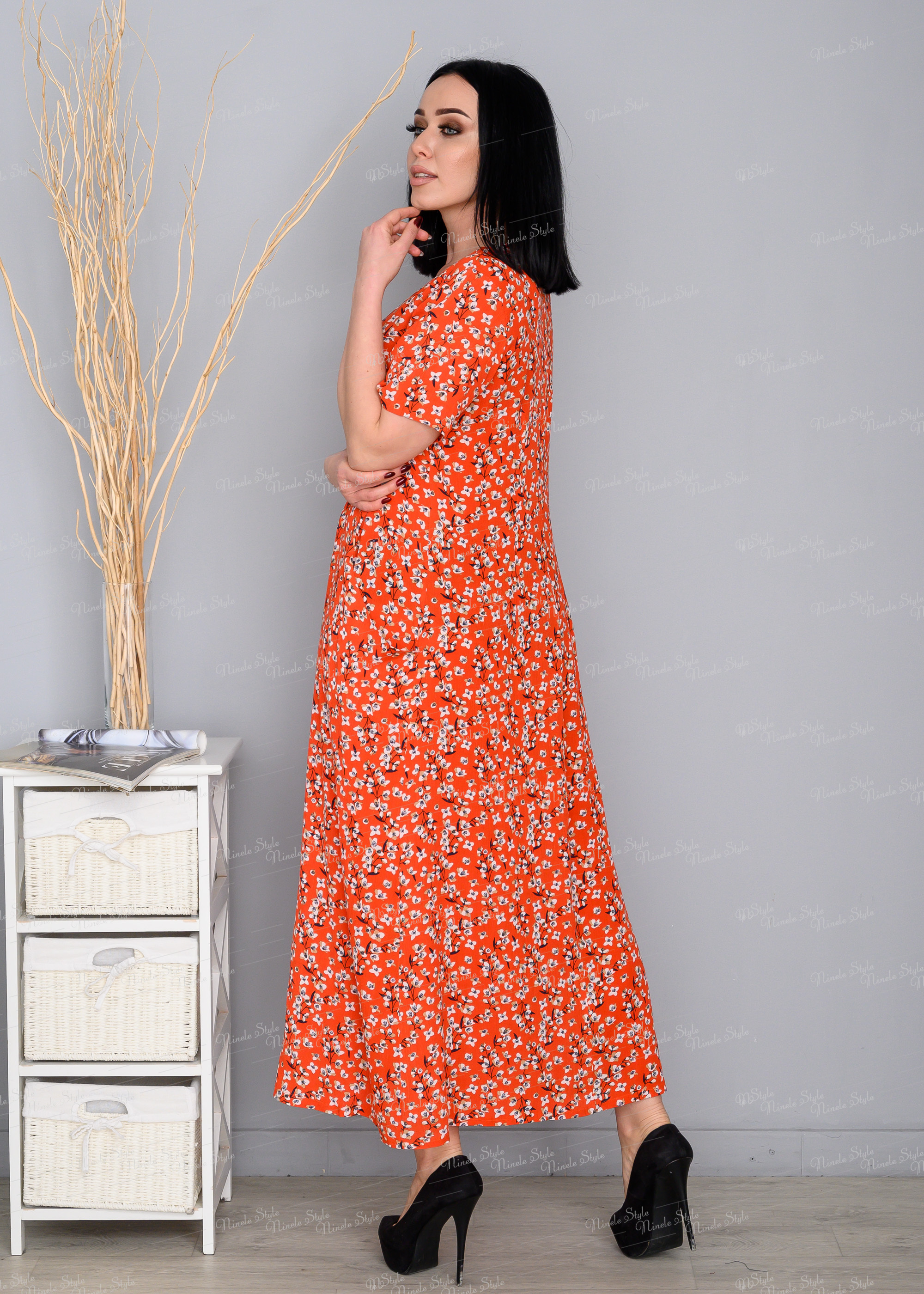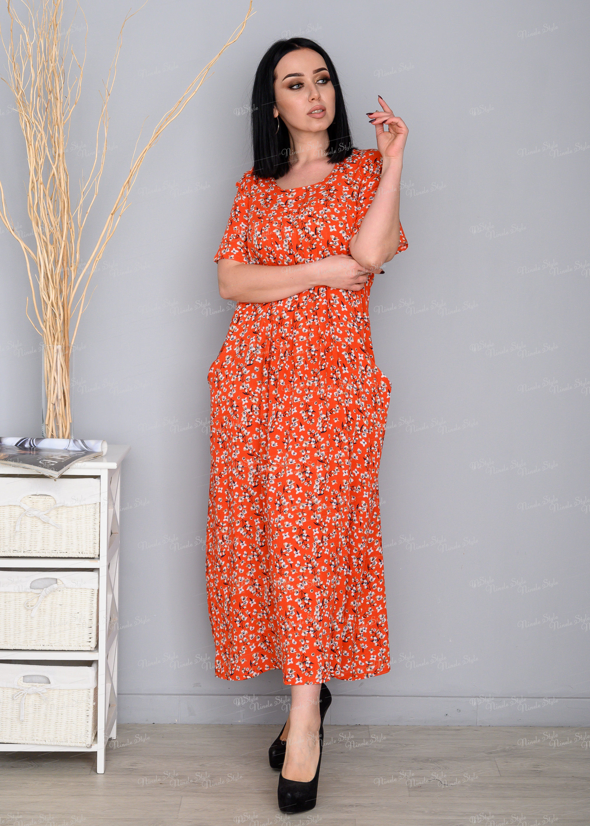 Платье женское предназначено для повседневной носки. Платье расширеное к низу,длинное. Перед с отрезной кокеткой,с отрезными бочками. Центральная  часть переда с 8-ю декоративными складками. В швах соединения  бочков с центральной частью переда обработаны карманы. Спинка со средним швом.Горловина круглая, обтачная. Рукав втачной , короткий, одношевный.