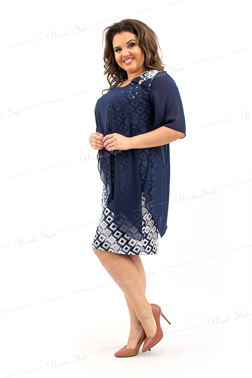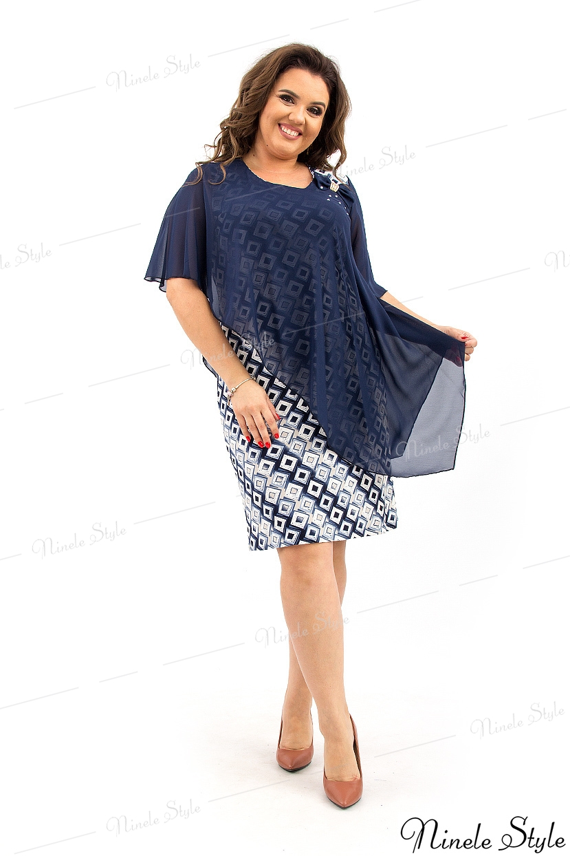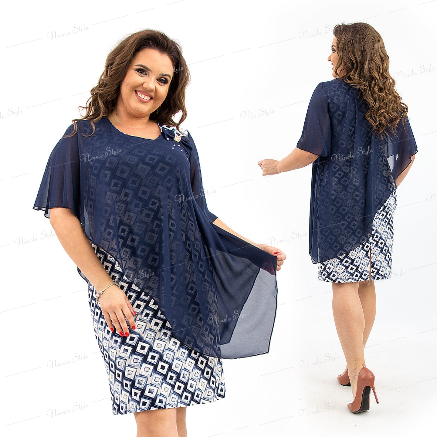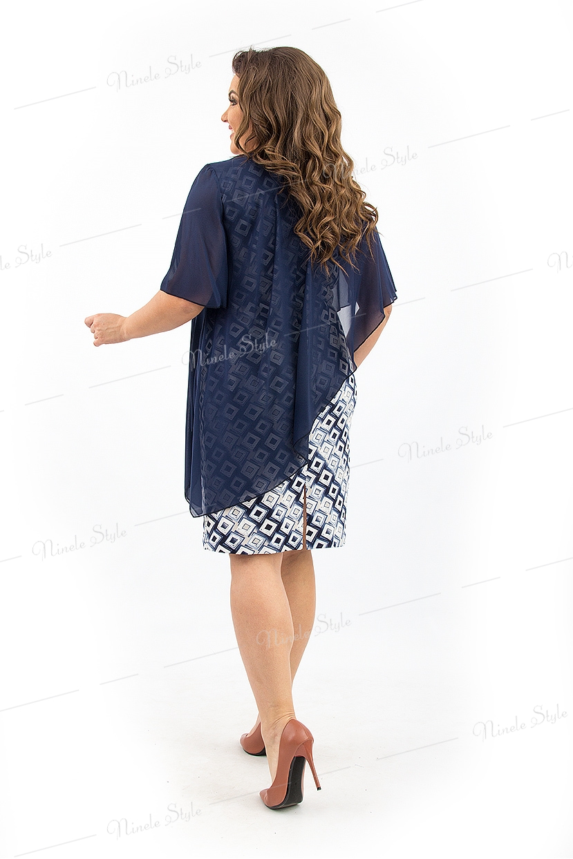 Элегантное вечернее платье синего цвета с накидкой из сетки позволит произвести впечатление на вечеринке, дне рождении или свадьбе. Платье выполненно из нежного и шелковистого трикотажа - "Масло".  Платье прямое, с узором "Ромб", длина до колена, сетчатая накидка гармонично дополняет образ платья, украшено брошкой в виде бантика.
