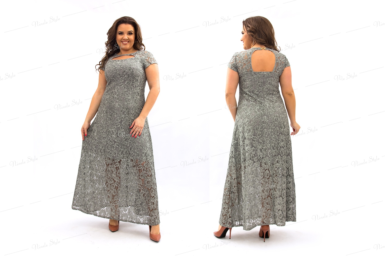 Светло-серое гипюровое вечернее женское платье с открытой спиной 275-3