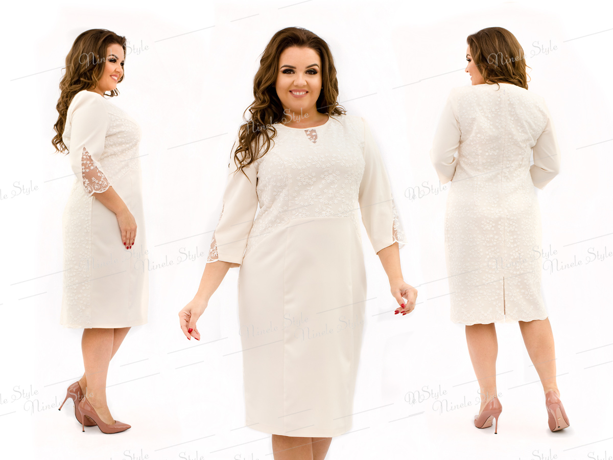 Платье женское полуприлегающего силуэта, чуть зауженное к низу. Длина платья зависит от размера. Рельефы на детали переда выходят из проймы в низ, проходят через центр груди. Детали переда двухслойные, нижняя часть из основной ткани с обтачным разрезом по горловине, верхняя часть из кружева. Боковые части спинки с двумя подрезами на линии талии, которые выходят из бокового шва и сходятся в одну точку к рельефу. Рельефы спинки прямые, выходят из шва притачивания кокетки вниз. Кокетка спинки состоит из пяти частей, центральная из кружева, средняя из основной ткани, плечевая часть двухслойная. В среднем шве спинки обработана застежка на потайную тесьму-молнию и шлица. Горловина круглая, углубленная, окантованная. Рукава вточные, одношевные, длиной 45 см. Изделие с плечевыми накладками.