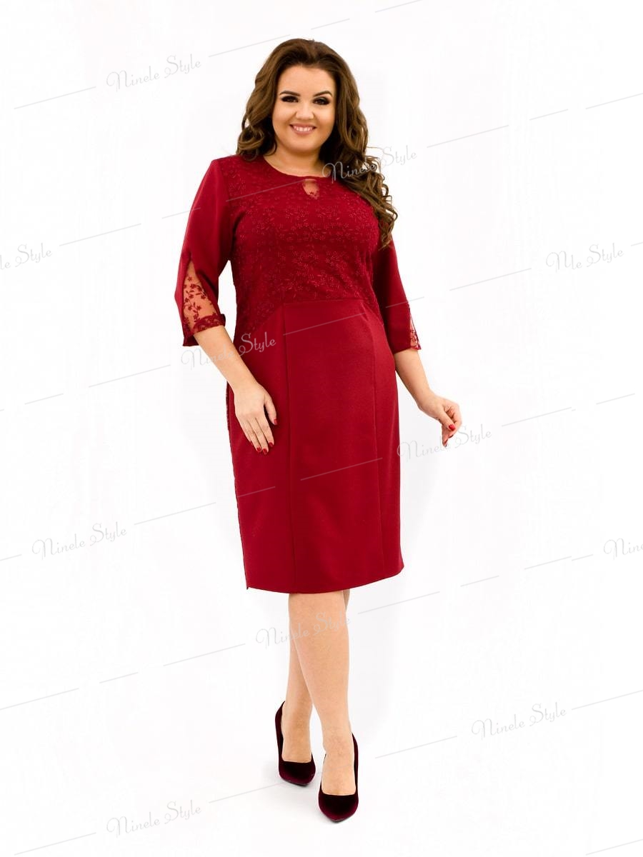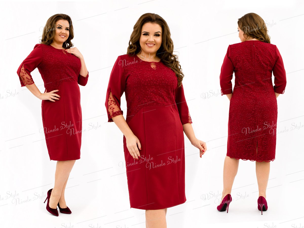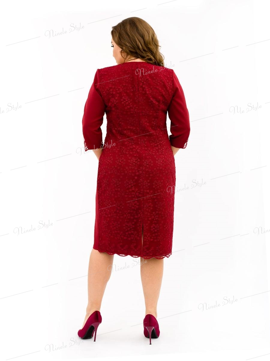 Платье женское полуприлегающего силуэта, чуть зауженное к низу. Длина платья зависит от размера. Рельефы на детали переда выходят из проймы в низ, проходят через центр груди. Детали переда двухслойные, нижняя часть из основной ткани с обтачным разрезом по горловине, верхняя часть из кружева. Боковые части спинки с двумя подрезами на линии талии, которые выходят из бокового шва и сходятся в одну точку к рельефу. Рельефы спинки прямые, выходят из шва притачивания кокетки вниз. Кокетка спинки состоит из пяти частей, центральная из кружева, средняя из основной ткани, плечевая часть двухслойная. В среднем шве спинки обработана застежка на потайную тесьму-молнию и шлица. Горловина круглая, углубленная, окантованная. Рукава вточные, одношевные, длиной 45 см. Изделие с плечевыми накладками.