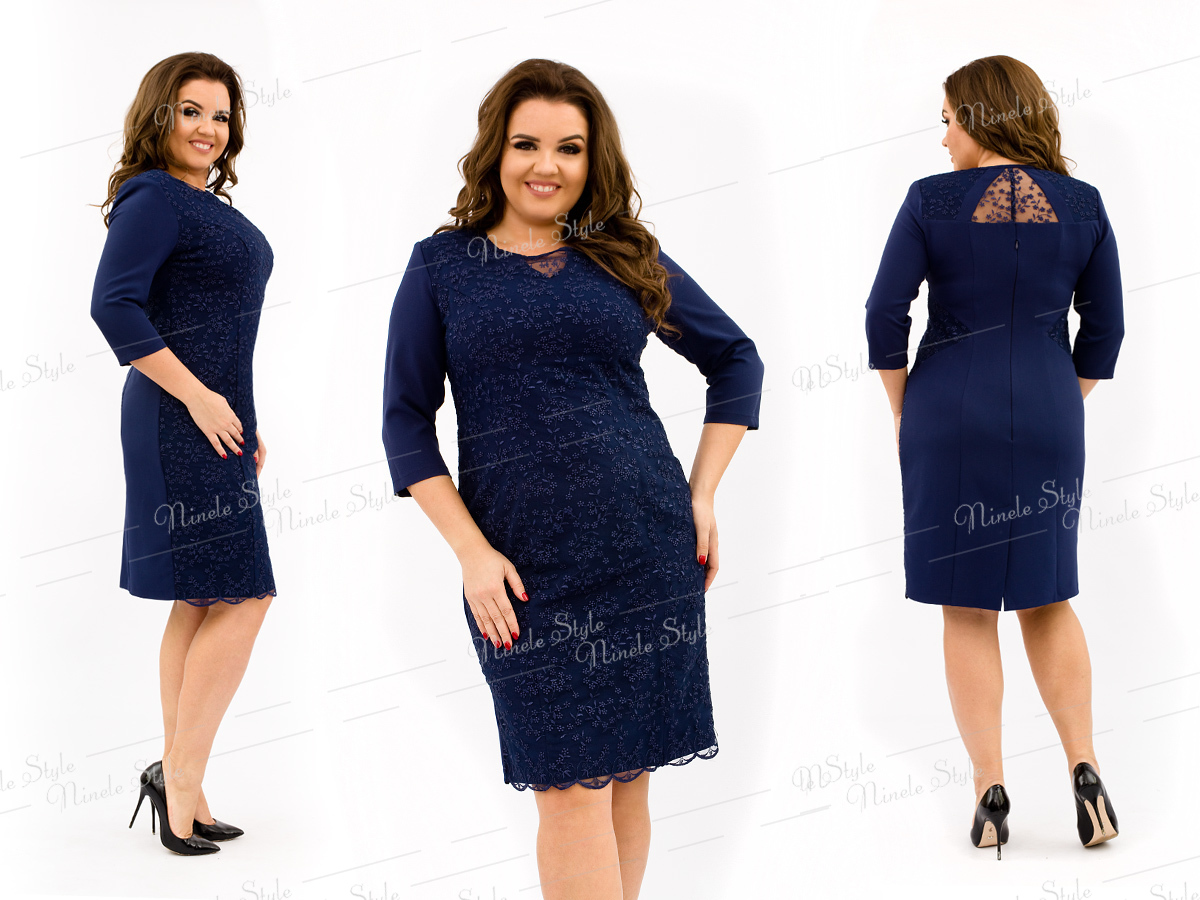 Платье женское полуприлегающего силуэта, чуть зауженное к низу. Длина платья зависит от размера. Рельефы на детали переда выходят из проймы в низ, проходят через центр груди. Детали переда двухслойные, нижняя часть из основной ткани с обтачным разрезом по горловине, верхняя часть из кружева. Боковые части спинки с двумя подрезами на линии талии, которые выходят из бокового шва и сходятся в одну точку к рельефу. Рельефы спинки прямые, выходят из шва притачивания кокетки вниз. Кокетка спинки состоит из пяти частей, центральная из кружева, средняя из основной ткани, плечевая часть двухслойная. В среднем шве спинки обработана застежка на потайную тесьму-молнию и шлица. Горловина круглая, углубленная, окантованная. Рукава вточные, одношевные, длиной 45 см. Изделие с плечевыми накладками.