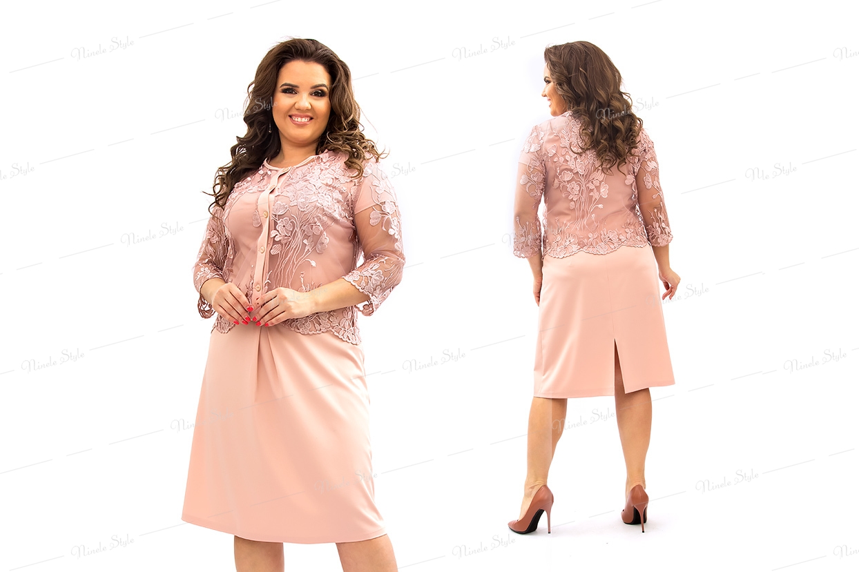 Нарядное женское платье  состоит из однотонного основного платья и кружевного укороченного болеро с рукавом. Платье полуприлегающего силуэта. Спинка со средним швом с застежкой на потайную молнию,внизу разрез. Болеро крепится к платью по горловине и пройме. Вырез круглый. Низ рукава болеро фигурный.