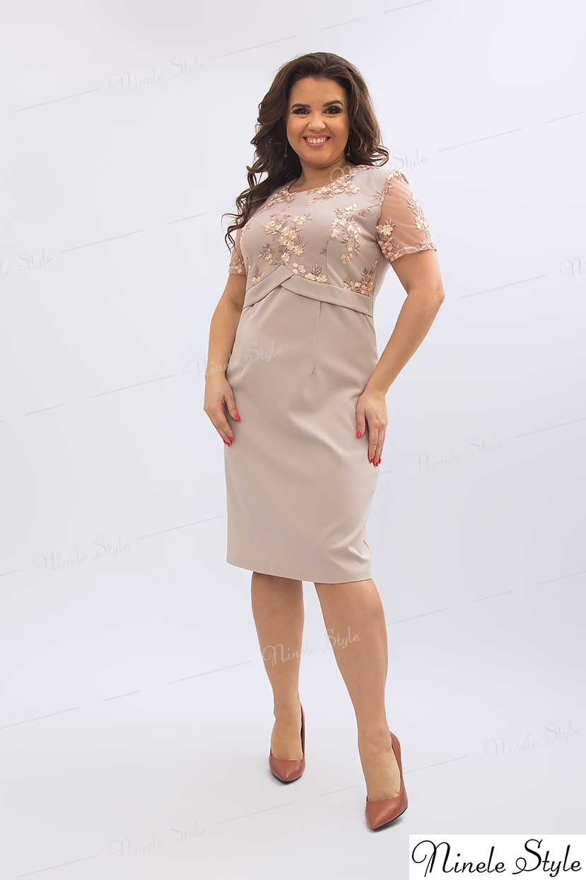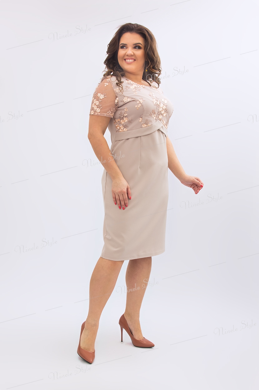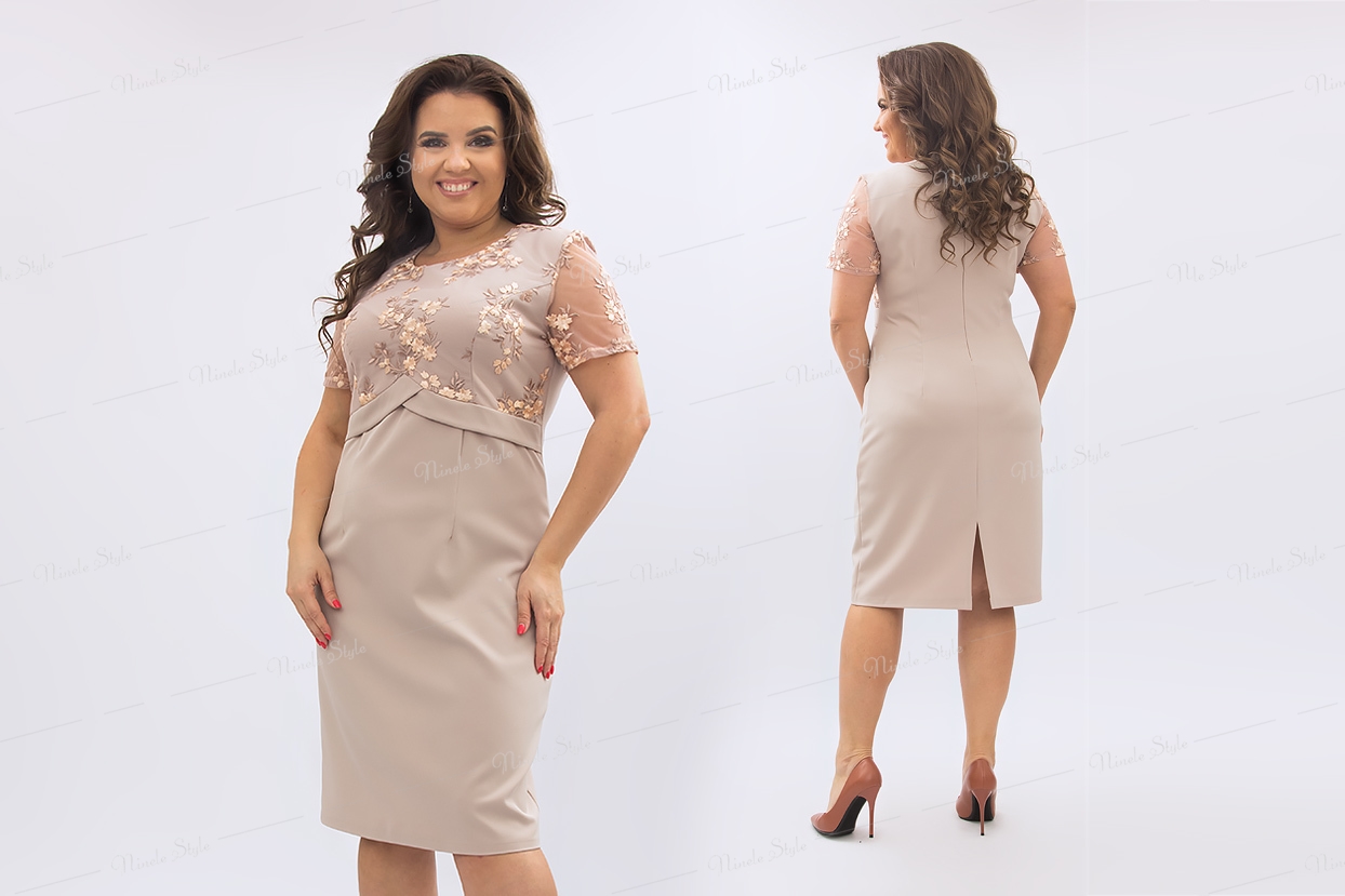 Бежевое однотонное женское платье украшенное сеткой с вышивкой 354-1