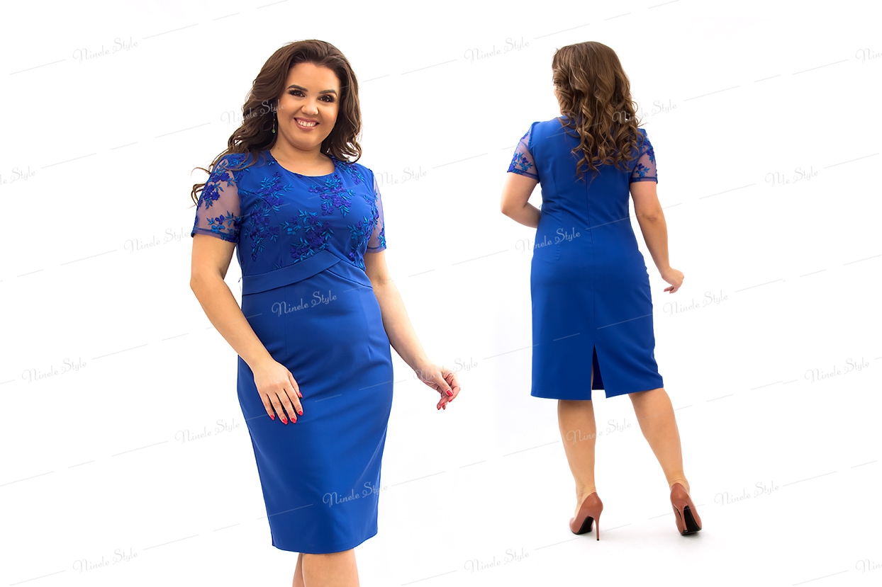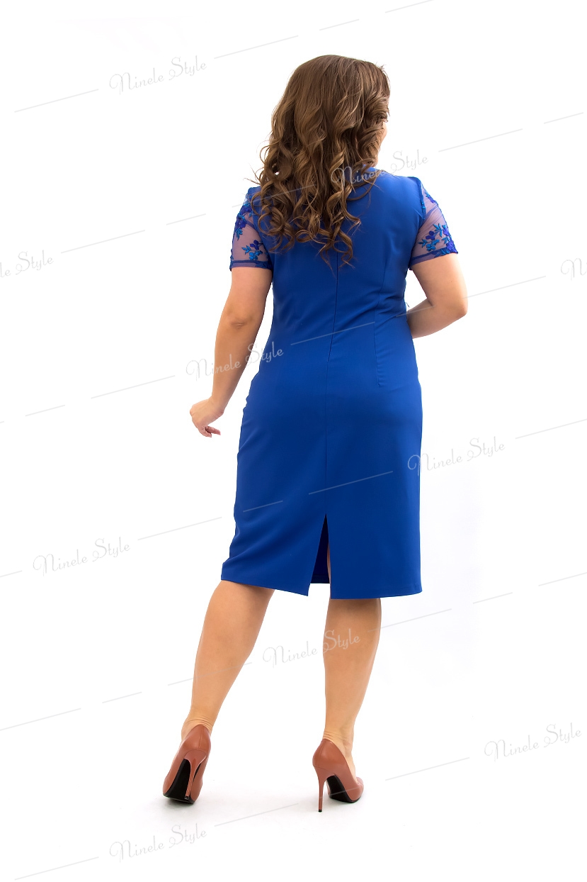 Синее однотонное женское платье украшенное сеткой с вышивкой 354-4