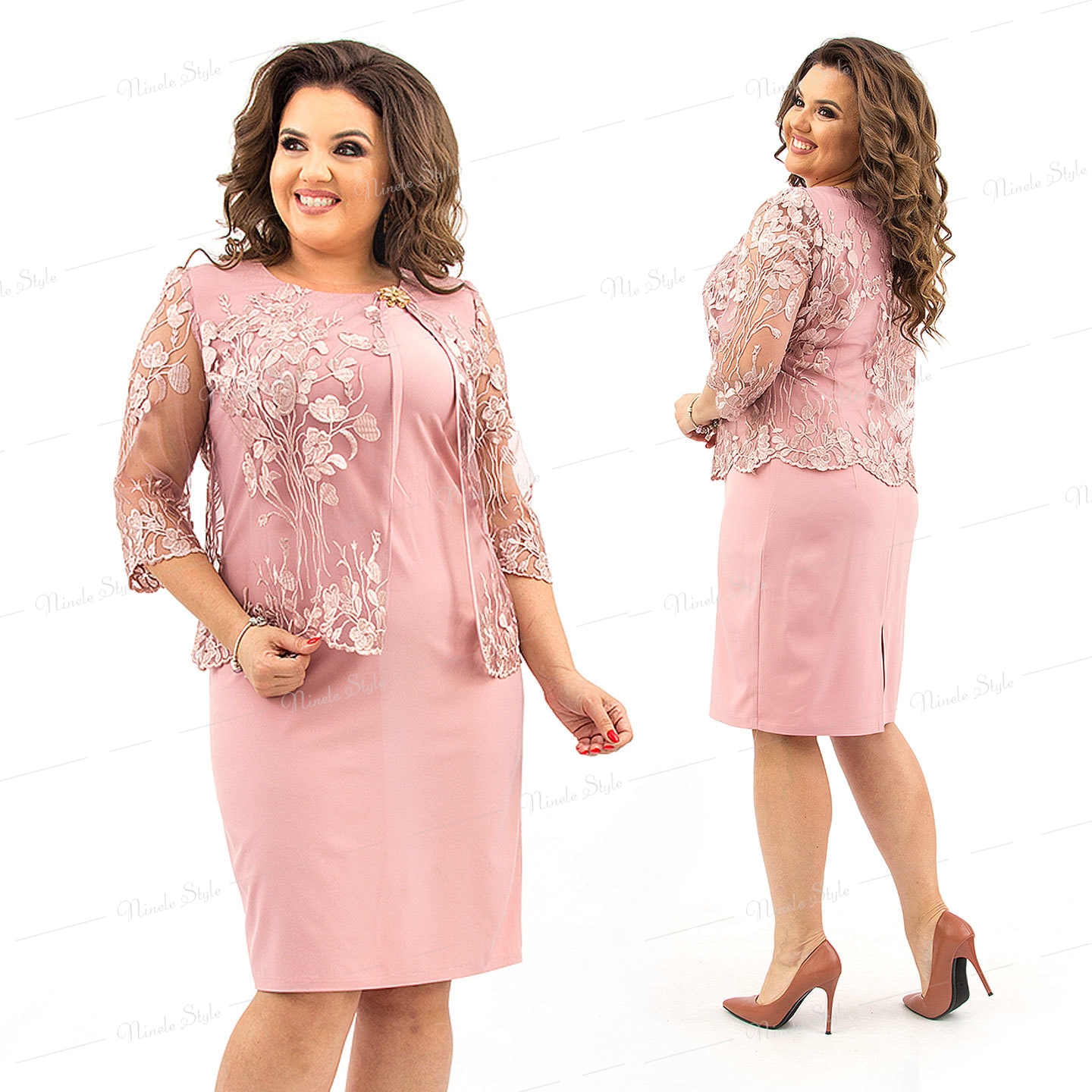Элегантное вечернее платье цвета пудра, полуприлегающего силуэта, чуть зауженное к низу, с отлетной накидкой из кружева будет шикарно смотреться на любом празднике. Платье выполнено из костюмной ткани. Спинка платья с талевыми выточками и со средним швом, в котором обработана застежка на потайную тесьму-молнию. Накидка и платье скреплены по горловине и по пройме. Рукава втачные, одношовные, из кружева. Изделие с плечевыми накладками. Платье украшено брошкой!