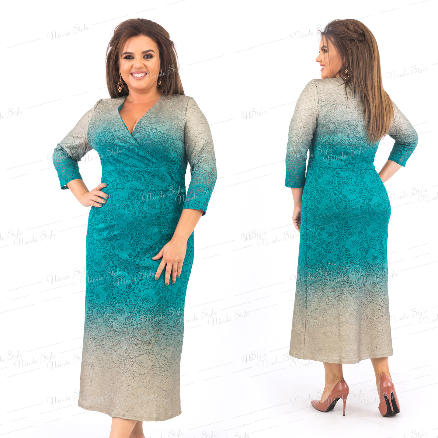 Элегантное платье с бирюзово-серым градиентом сделает ваш образ неповторимым. Длина данной модели позволит вам комфортно чувствовать себя как на вечеринке так и на деловой встрече. Изюминкой платья является запах в зоне декольте, а так же цветочный орнамент бирюзового гипюра, с серым напылением. Гипюр эластичен, это даст идеальную посадку по фигуре. В этом платье вы будете выглядеть элегантно и женственно.